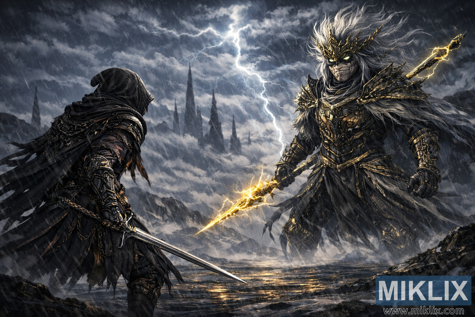 Fırtınalı bir gökyüzünün altında, yükselen gök gürültüsü bulutlarının canlı bir okyanus gibi çalkalandığı, parlak şimşeklerin yarıldığı ve dünyayı kısa süreliğine soğuk beyaz bir ışıkla yıkadığı, uçsuz bucaksız, fırtınalı bir çorak arazi uzanıyor. Kamera, yakın bir düello perspektifinden daha geride konumlandırılmış olup, savaş alanının ve ötesindeki harap ufkun geniş bir görünümünü ortaya koyuyor. Uzakta, unutulmuş bir medeniyetin iskelet kalıntıları gibi sivri siyah kuleler yükseliyor, kısmen sürüklenen sis ve kompozisyon boyunca çapraz olarak akan yağmur damlalarıyla örtülmüş durumda. Zemin, koyu taş, sığ yansıtıcı su ve düzensiz kayalık çıkıntıların bir karışımı olup, yağmurun dalgalanan havuzlar halinde toplandığı doğal kanallar oluşturuyor. Bu su birikintileri, şimşek ve zırhın kırık yansımalarını yansıtarak, toprağı aksi halde soluk tonlar arasında gümüş ve altın parıltılı bir mozaik haline getiriyor.
