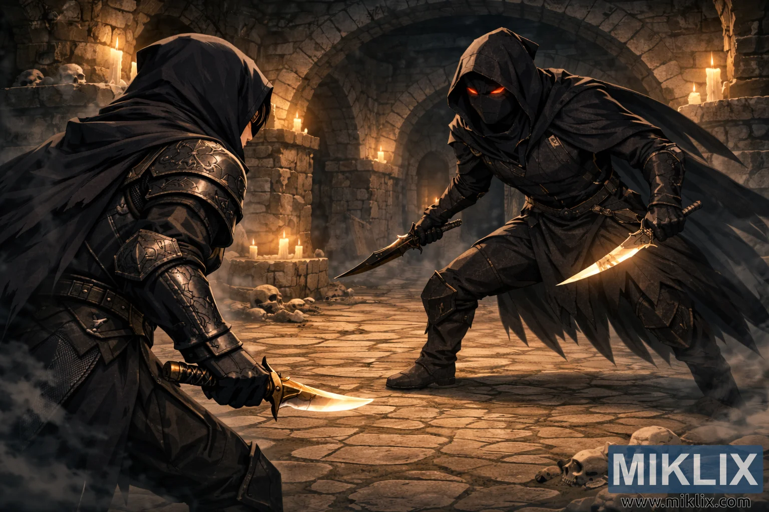 Çerçevenin sağ tarafına hakim olan Kara Bıçaklı Suikastçı, önemli ölçüde daha büyük ölçekte tasvir edilerek anında bir tehdit ve dengesizlik duygusu yaratıyor. Suikastçının silueti geniş ve heybetli, çevredeki taş duvarların karanlığıyla neredeyse bütünleşen katmanlı siyah giysiler ve zırhla sarılmış. Derin bir başlık yüz özelliklerinin çoğunu gizlerken, kumaşın altından iki delici kızıl göz parlıyor ve dikkat çeken ürpertici bir odak noktası oluşturuyor. Suikastçı, her an atılmaya hazır gibi dizleri bükülmüş ve gövdesi öne doğru açılı, avcı bir duruşta hafifçe çömelmiş. Her iki elinde de hafif kehribar rengi bir parıltı yayan kavisli bir hançer var, keskin kenarları mum ışığını yakalayarak keskin metalik parıltılar oluşturuyor. İki figür arasındaki abartılı boyut farkı gerilimi artırıyor ve çatışmanın yakın tehlikesini pekiştiriyor.