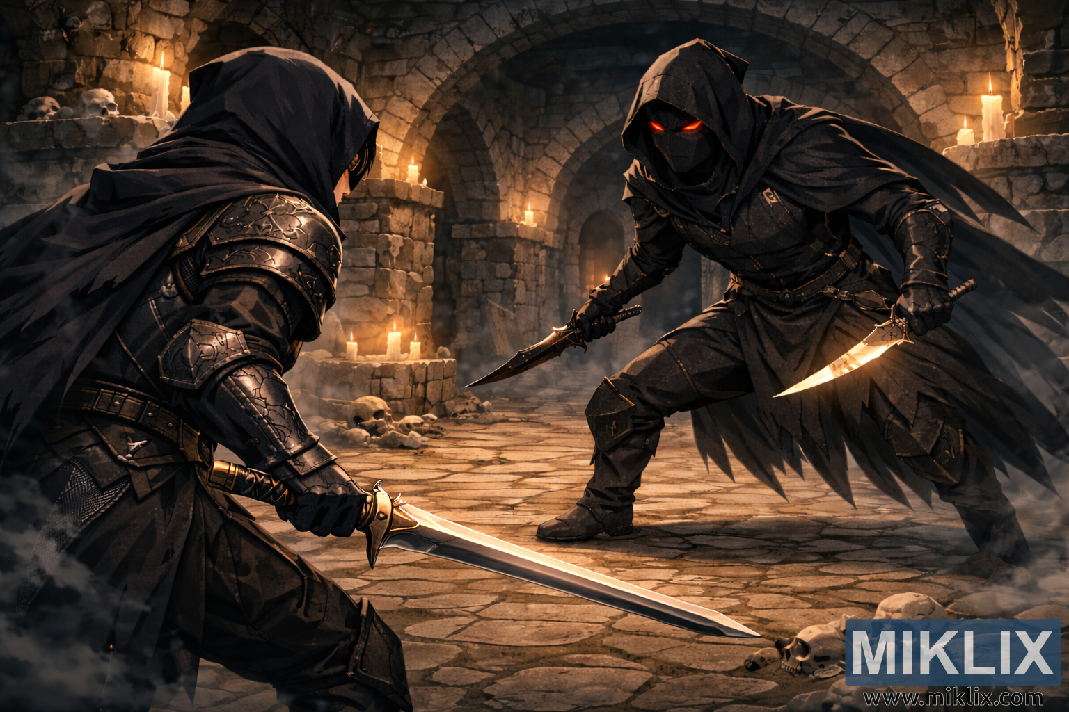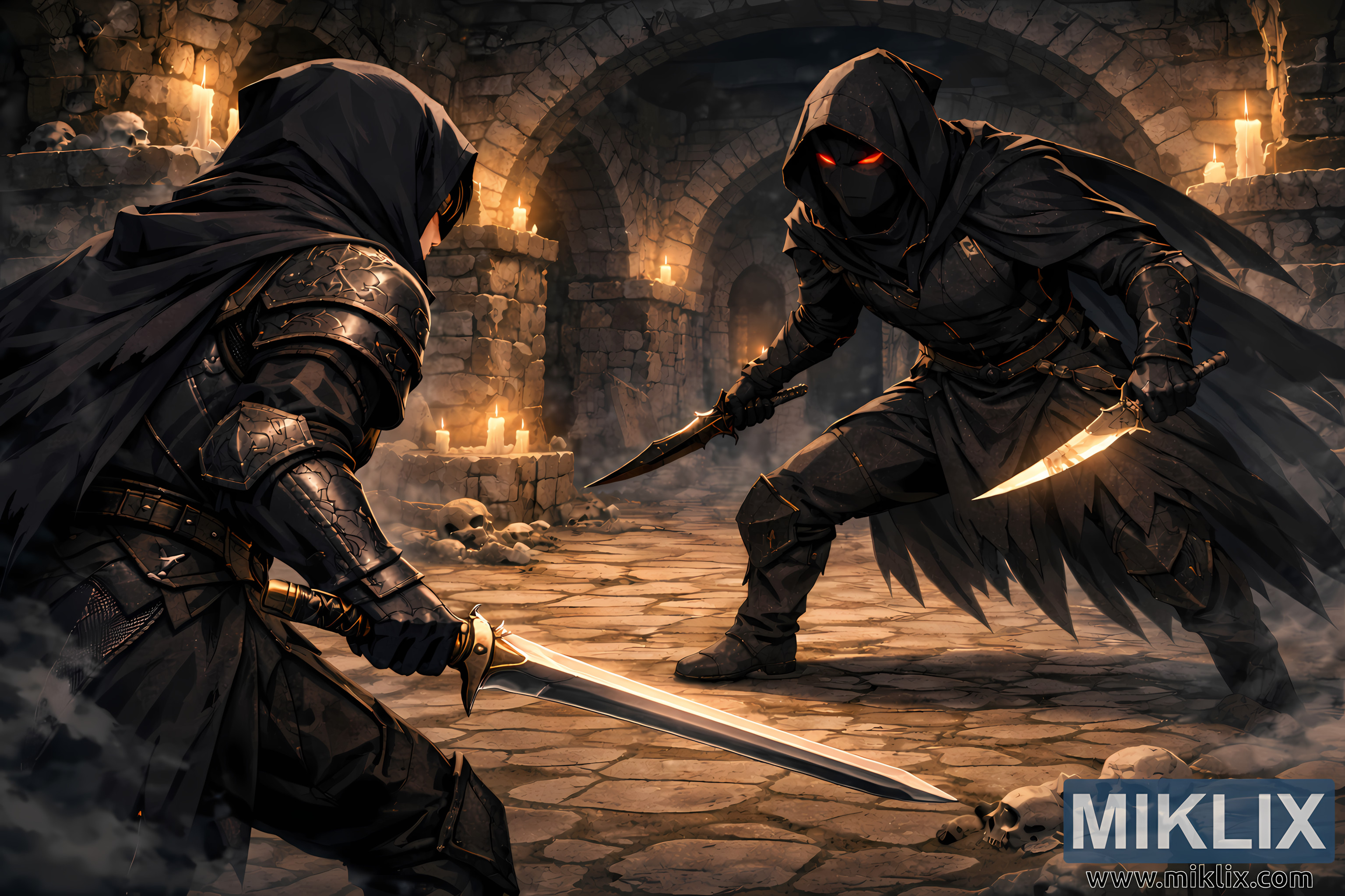Kompozisyonun sağ tarafına hakim olan Kara Bıçaklı Suikastçı, belirgin şekilde daha büyük ölçekte tasvir edilerek anında bir tehdit ve dengesizlik duygusu yaratıyor. Suikastçının silueti geniş ve heybetli, kat kat siyah giysiler ve zırhlarla sarılmış, neredeyse mezarlık duvarlarının gölgeleriyle birleşiyor. Derin bir başlık yüz özelliklerinin çoğunu gizliyor, ancak kumaşın altında parlayan iki canlı kırmızı göz, dikkat çeken ve gerilimi artıran ürpertici bir odak noktası oluşturuyor. Suikastçı, dizleri bükük ve gövdesi öne doğru açılı, her an saldırmaya hazır bir şekilde yırtıcı bir duruşta çömelmiş durumda. Her iki elinde de hafif kehribar rengi bir parıltı yayan kavisli bir hançer bulunuyor; keskin kenarları mum ışığını yakalayarak, Kara Bıçaklı Suikastçının düz kılıcıyla tezat oluşturan keskin metalik vurgular yaratıyor. Abartılı boyut farkı, tehlike duygusunu artırıyor ve ilk darbe vurulmadan önce güç dengesizliğini vurguluyor.