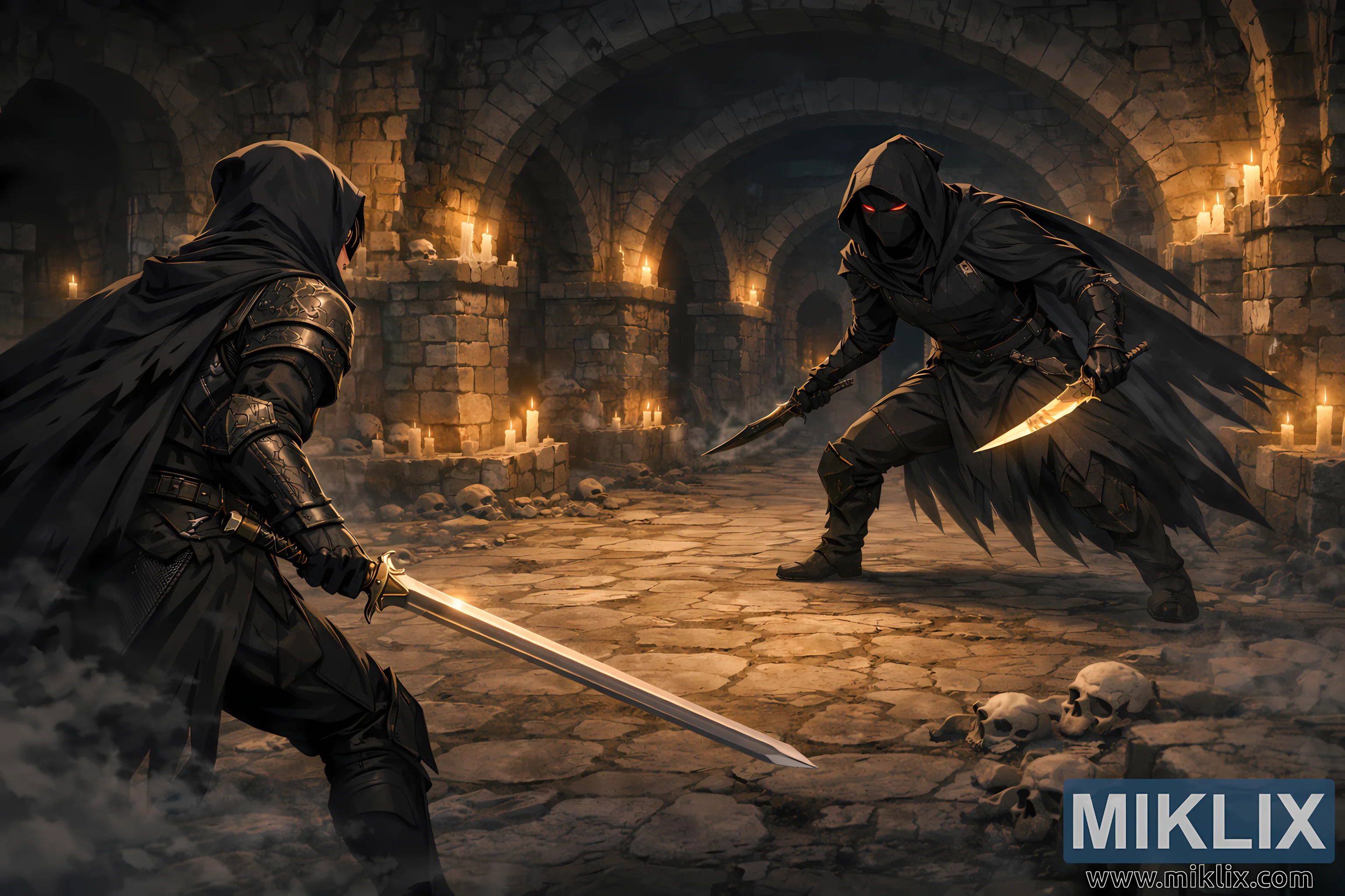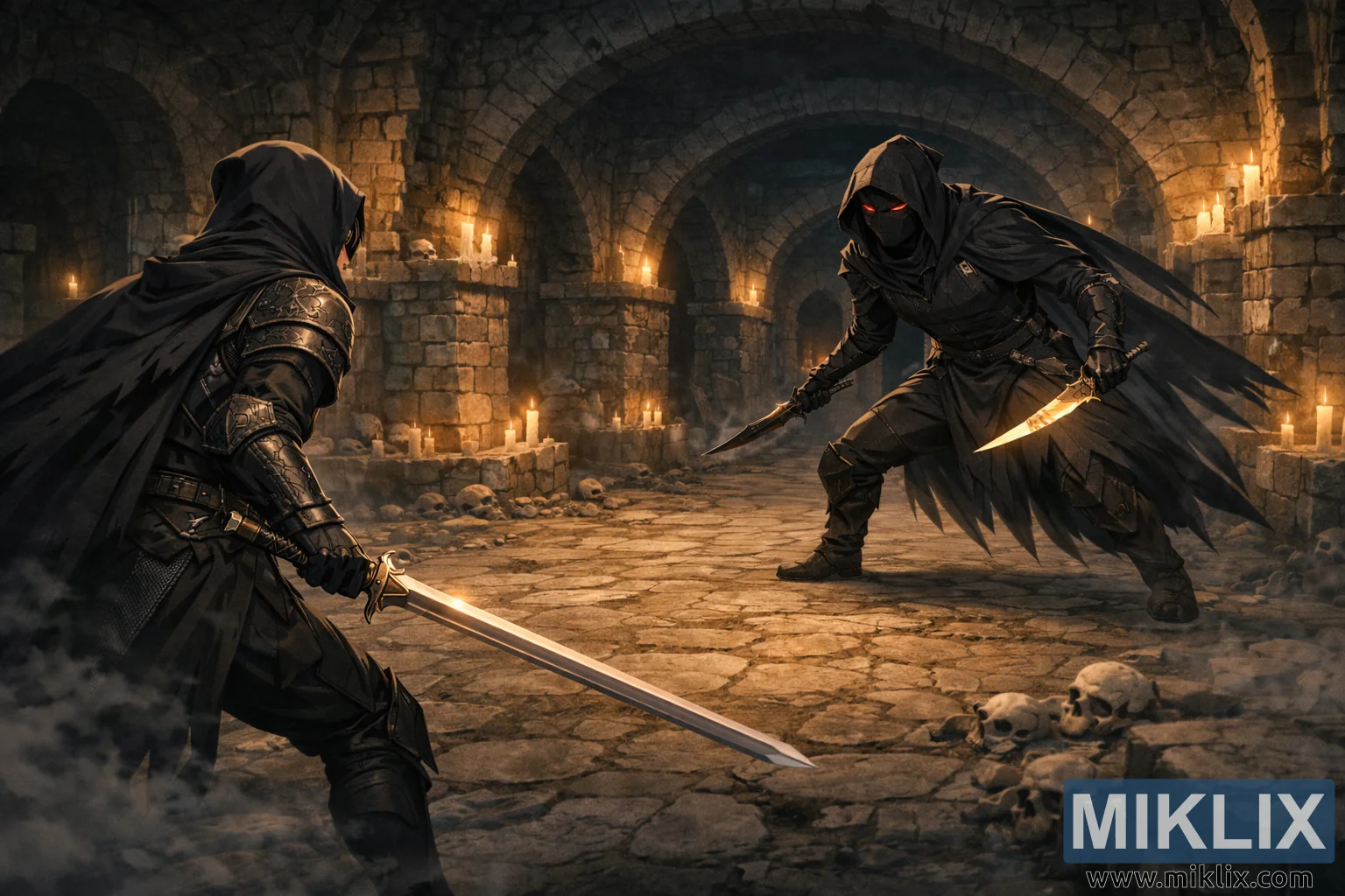 Çerçevenin sağ tarafına hakim olan Kara Bıçaklı Suikastçı, belirgin şekilde daha büyük ölçekte tasvir edilerek anında bir tehdit ve dengesizlik hissi yaratıyor. Suikastçının silueti geniş ve heybetli, kat kat siyah giysiler ve zırhlarla sarılmış, neredeyse yeraltı mezarlığı duvarlarının karanlığıyla birleşiyor. Derin bir başlık yüz detaylarının çoğunu gizliyor, ancak kumaşın altında parlayan iki canlı kırmızı göz, dikkat çeken ürpertici bir odak noktası oluşturuyor. Suikastçı, dizleri bükük ve gövdesi öne doğru açılı, her an saldırmaya hazır bir şekilde yırtıcı bir duruşta çömelmiş durumda. Her iki elinde de hafif kehribar rengi bir parıltı yayan kavisli bir hançer bulunuyor; keskin kenarları mum ışığını yakalayarak, Kara Bıçaklı Suikastçının düz kılıcıyla tezat oluşturan keskin metalik vurgular yaratıyor. Boyutlardaki abartılı fark, gerilimi artırıyor ve ilk darbe vurulmadan önce yaklaşan tehlikeyi pekiştiriyor.