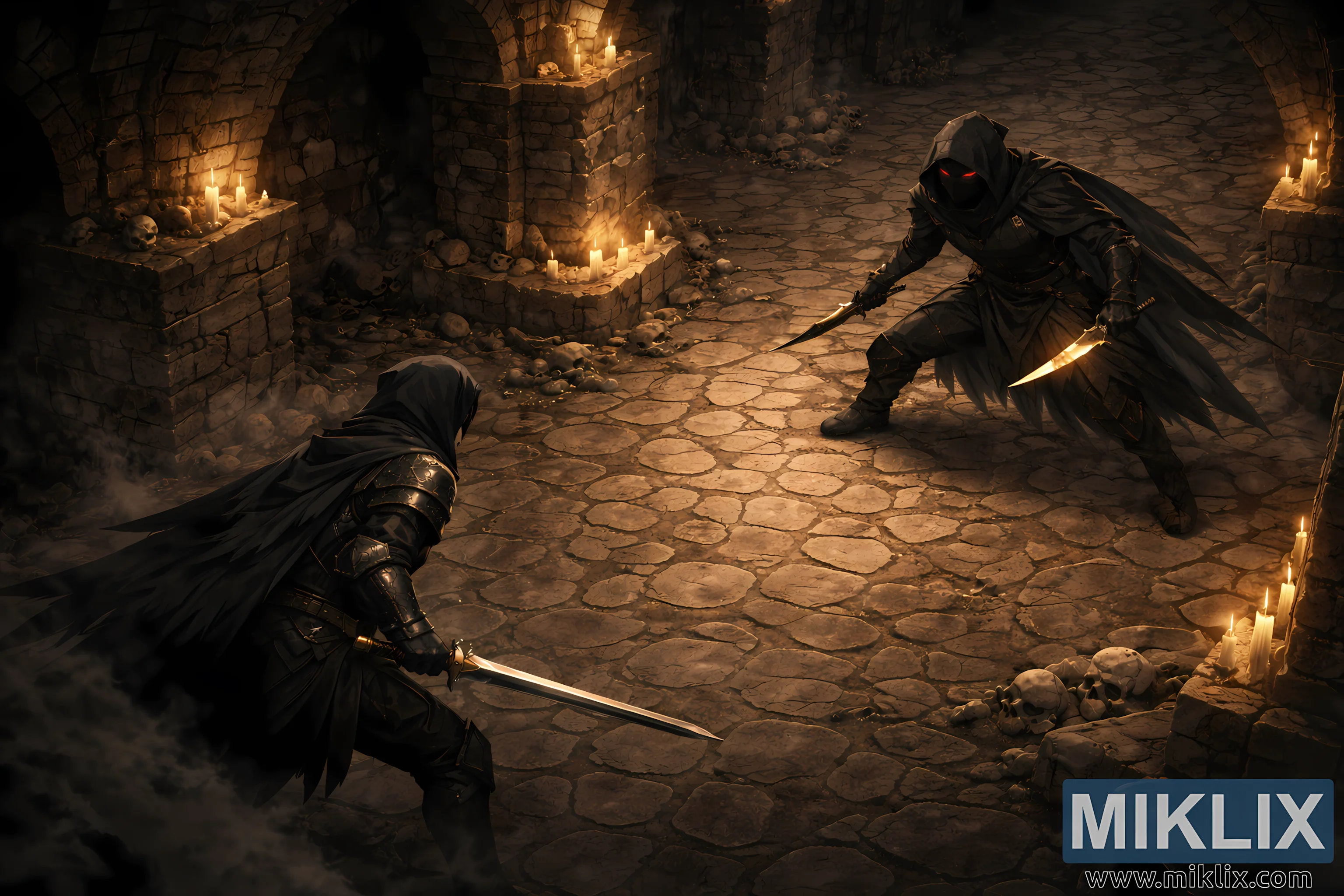 Yüksek çözünürlüklü, yarı gerçekçi, karanlık fantezi türündeki bir illüstrasyon, geniş bir yeraltı mezarlığında gergin bir savaş öncesi karşılaşmayı, ortamın daha geniş bir bölümünü ortaya çıkaran ve ölçek ile mekânsal derinliği vurgulayan, geriye çekilmiş, yüksekten bir izometrik perspektiften yakalıyor. Kamera açısı yukarıdan hafifçe aşağıya doğru bakıyor ve izleyicinin hem savaşçıları hem de çevredeki mimariyi aynı anda gözlemlemesine olanak tanıyarak stratejik, neredeyse taktiksel bir bakış açısı yaratıyor. Yüzyıllar boyunca biriken çatlaklar, aşınma ve koyu nem lekeleriyle işlenmiş, eski taş tuğlalardan yapılmış devasa kemerli tavanlar başın üzerinde kıvrılıyor. Kalın kare sütunlar koridoru tekrarlayan bölümlere ayırıyor, her biri titreyen mum kümeleriyle dolu sığ taş çıkıntıları destekliyor. Mum alevlerinden yayılan sıcak kehribar parıltısı, düzensiz kaldırım taşlı zemine yayılıyor ve sütunlar arasındaki serin, gölge dolu girintilerle tezat oluşturan düzensiz ışık havuzları oluşturuyor. Soluk sis, yere yakın bir şekilde süzülüyor, etrafa saçılmış kafatasları, moloz yığınları ve unutulmuş çatışmaları ve uzun zamandır terk edilmiş mezarları çağrıştıran kırık duvar parçaları arasında dolanıyor. Daha uzakta, arka planda, ek kemerli geçitler karanlığa doğru uzanarak, görünür odanın çok ötesine uzanan geniş bir tünel labirentini ima ediyor ve enginlik hissini pekiştiriyor.