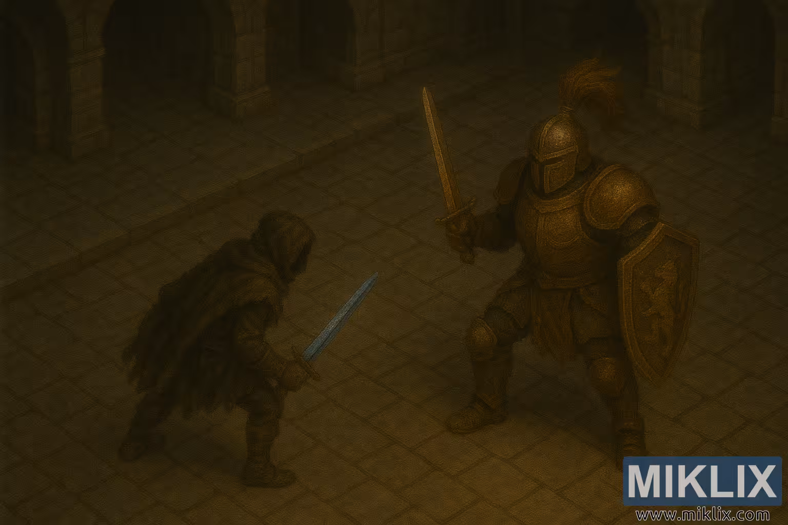 Sol tarafta, gölgelerle bütünleşen koyu, yırtık pırtık kumaşlara bürünmüş bir şekilde duruyor. Duruşu alçak ve öne eğik, ağırlığı şövalyeye doğru, kılıcı iki elinde, hazır bir şekilde aşağıya doğru eğik. Kılıcın soğuk mavi çeliği, çevredeki ortamla keskin bir tezat oluşturuyor; kenarları loş odadan süzülen azıcık ışığı yakalayarak kahramana hayaletsi bir varlık kazandırıyor. Yüzü kukuletasıyla gizlenmiş -kimliği karanlık tarafından yutulmuş- ve silüeti, rakibinin sıcak pirinç parıltısına karşı hayalet gibi duruyor.