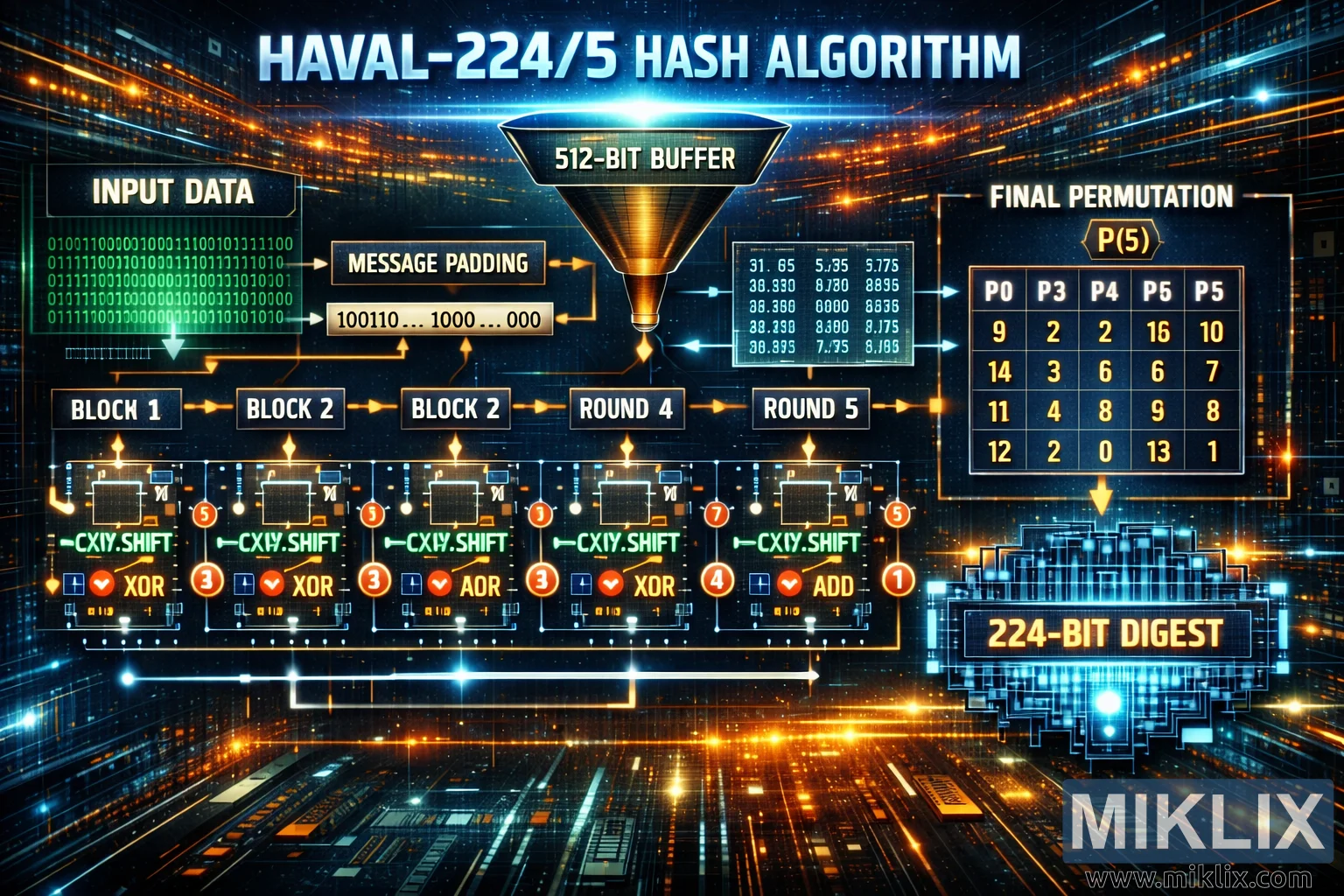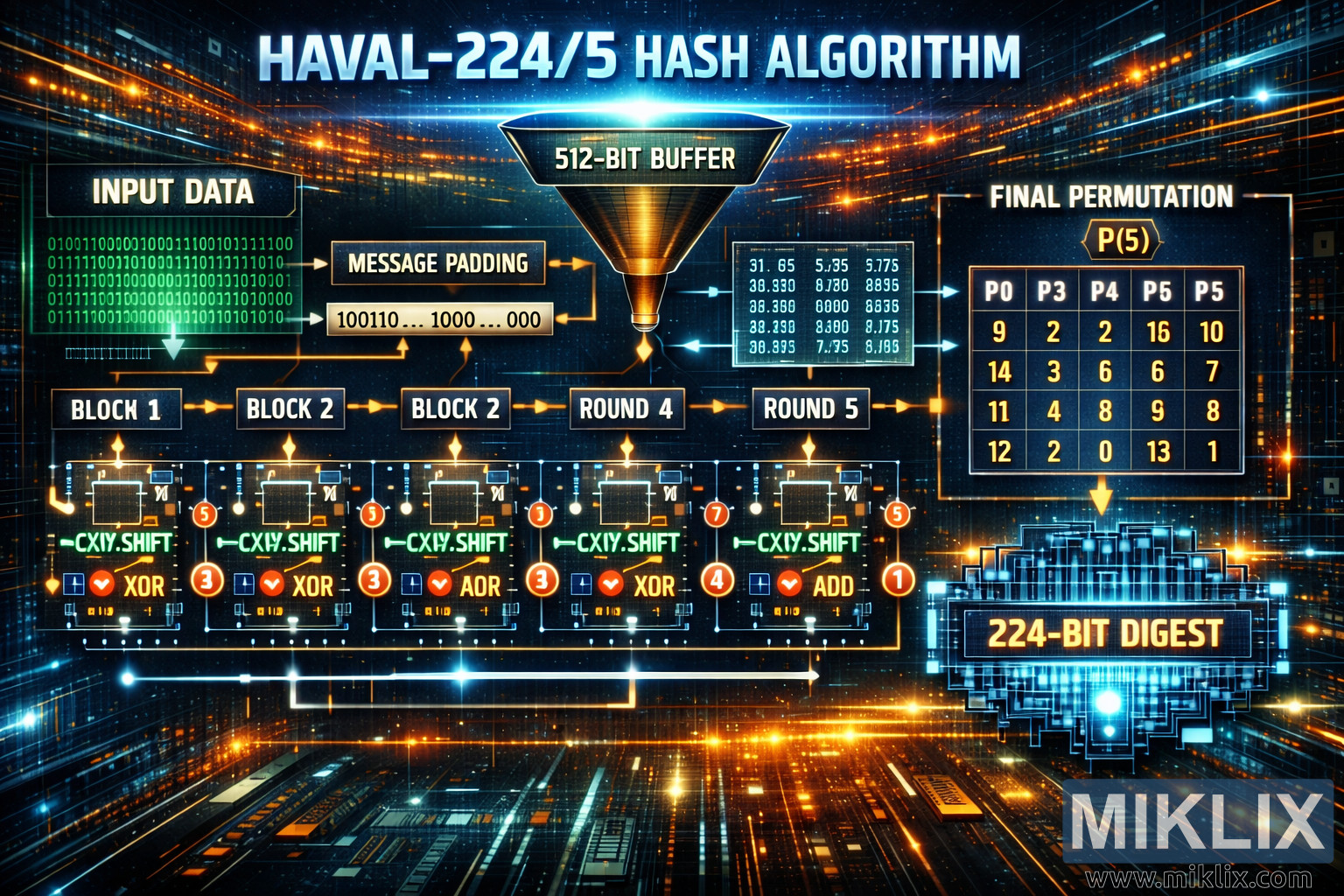 Праворуч від раундів, сяюча матриця під назвою «FINAL PERMUTATION P(5)» представляє сітку чисел під такими заголовками, як P0, P3, P4 та P5, що ілюструє графік перестановок, застосований на останньому етапі HAVAL-224/5. Ця структурована таблиця контрастує з плавними лініями даних, підкреслюючи ідею детермінованого перетворення. Від цього блоку перестановок яскрава стрілка спускається до кінцевого пристрою виведення: кристалічного, багатошарового ядра процесора з позначкою «224-BIT DIGEST». Цей елемент пульсує електрично-блакитним світлом, символізуючи компактне хеш-значення, створене алгоритмом.