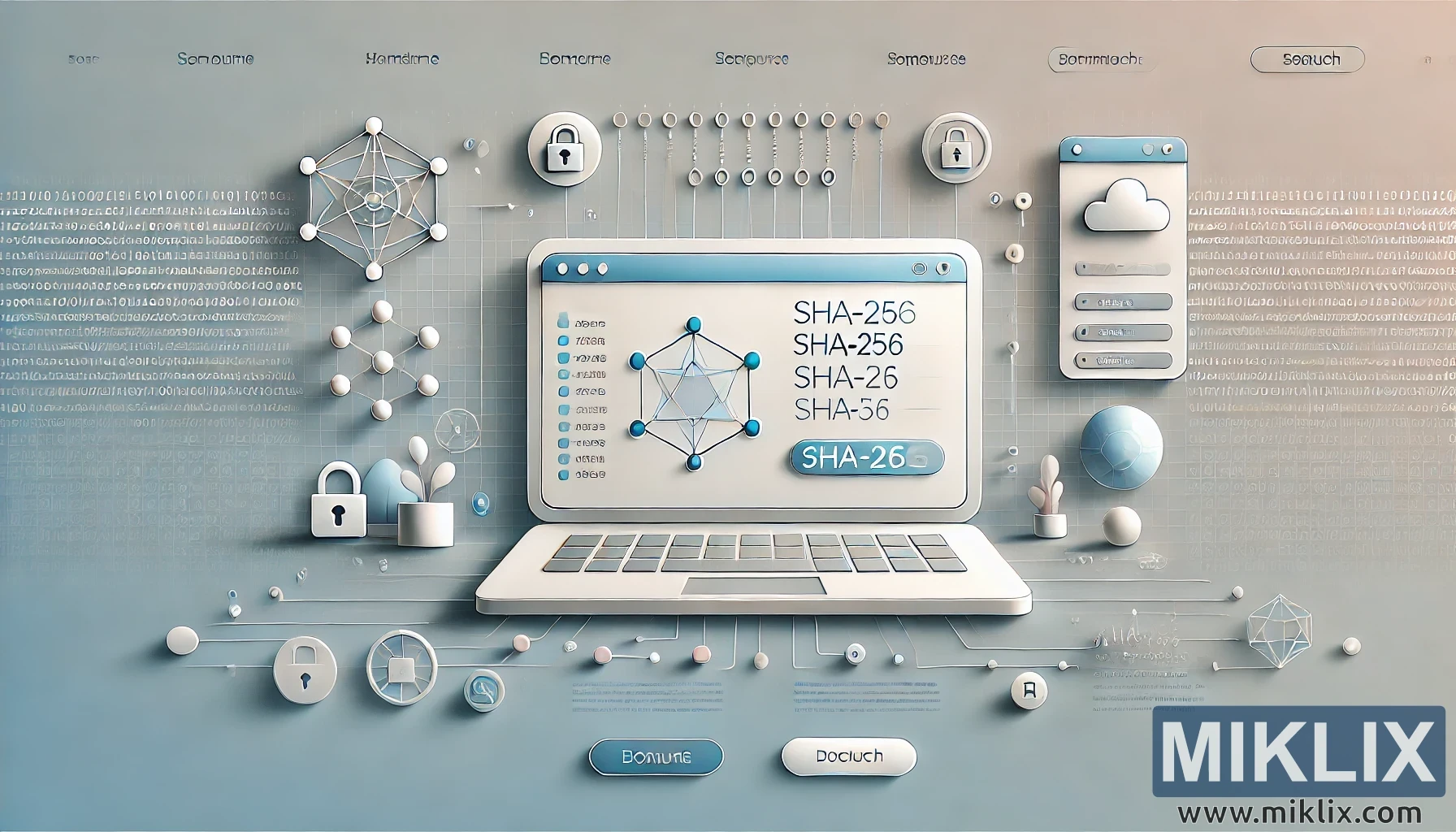 Абстрактна ілюстрація онлайн-калькуляторів хеш-функцій з ноутбуком, текстом SHA-256, замками та хмарними іконками для кібербезпеки.