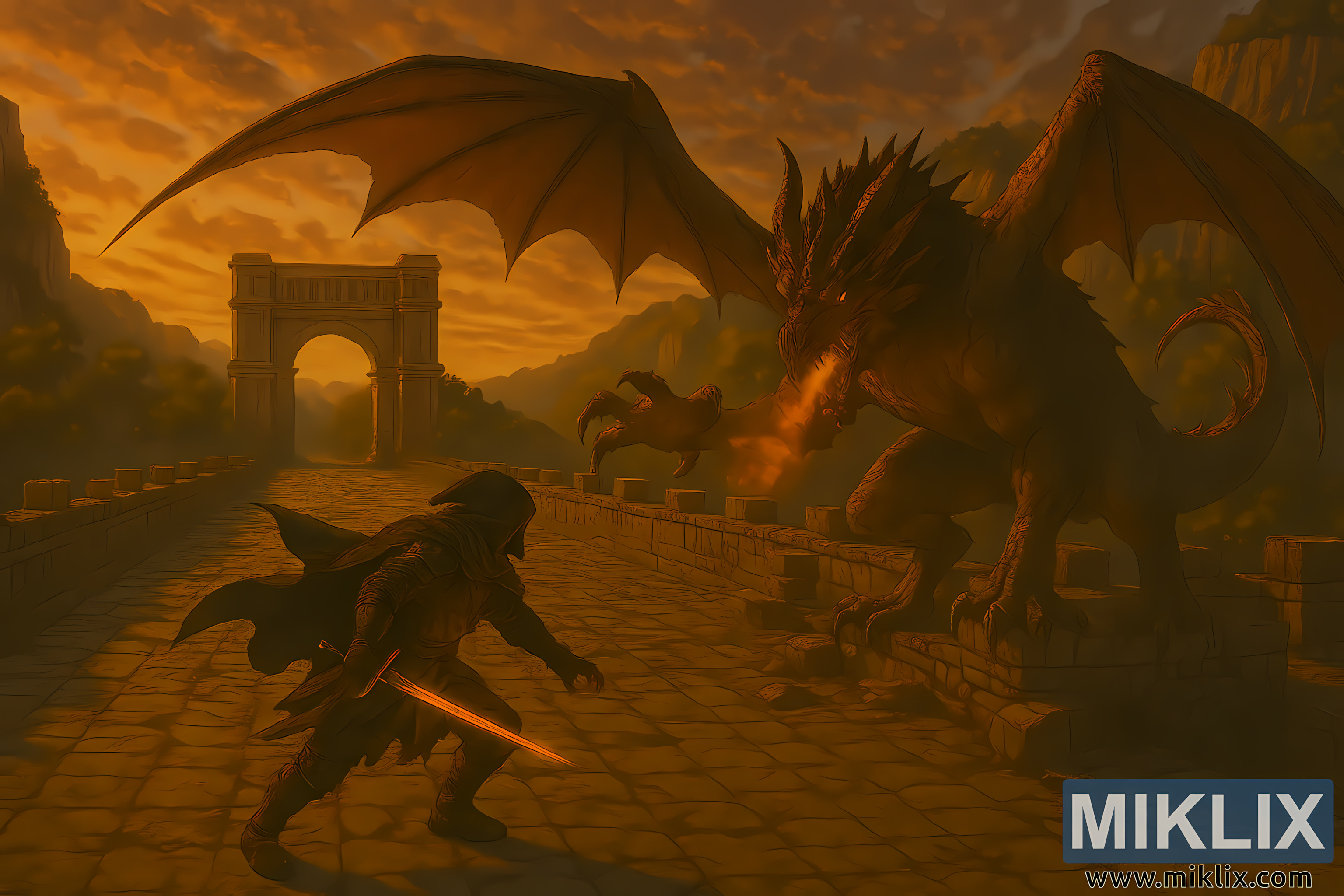 Небо являє собою драматичне поєднання помаранчевого, червоного та жовтого кольорів, з хмарами, що клубочаться, що ловлять останнє світло дня. Освітлення по всьому зображенню тепле та спрямоване, відкидаючи довгі тіні та підкреслюючи текстури обладунків, каменю та луски. Композиція збалансована та кінематографічна, воїн і дракон розташовані по діагоналі, а ворота та скелі утворюють природну рамку.