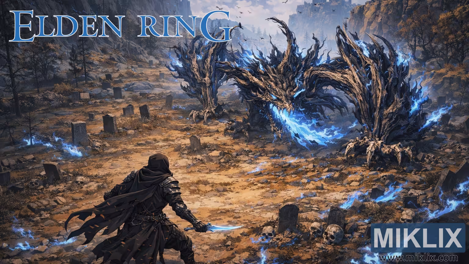 Зображення викликає теми непокори, смертності та примарної помсти, що відповідає наративному тону «Тіні Ердтрі». «Затьмарений», хоча й затьмарений драконами, стоїть непохитним — символ наполегливості попри неможливі труднощі. Наявність назви «ELDEN RING» стилізованим синім шрифтом у верхньому лівому куті та водяного знака «MIKLIX» із посиланням на веб-сайт у нижньому правому куті свідчить про професійне фан-арт, призначене для використання в каталозі або рекламі.