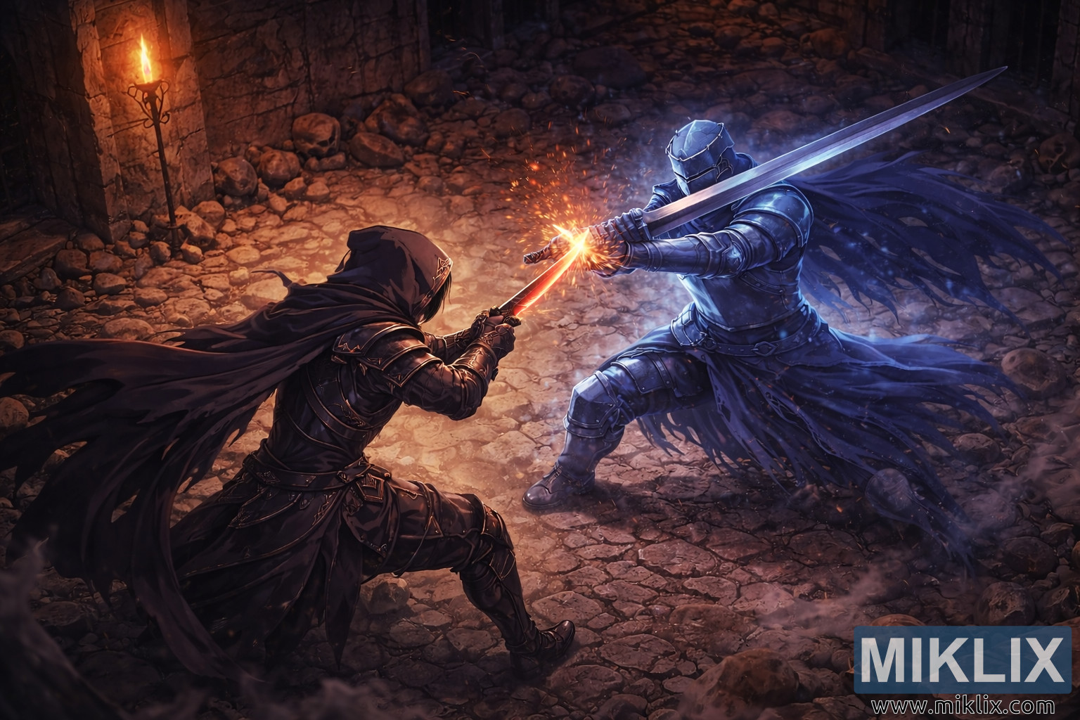 У верхньому лівому кутку біля кам'яної стіни горить один смолоскип, його полум'я мерехтить помаранчевим і золотим кольорами. Світло цього смолоскипа розливається по підлозі, відкидаючи довгі, уривчасті тіні та ловлячи пил і дим, що кружляють навколо ніг бійців. Атмосфера наповнена дрейфуючими частинками, ніби саме підземелля видихає стародавнє дихання з кожним зіткненням сталі.