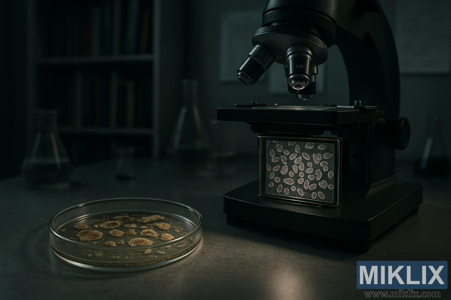 Одразу за чашкою Петрі маячить мікроскоп, його лінзи спрямовані на предметне скло, що показує ту саму проблемну культуру дріжджів у збільшених деталях. Під пильним оглядом мікроскопа аномалії стають ще більш вираженими. Овальні клітини, зазвичай однорідні та яскраві у здорових культурах, тепер демонструють ознаки стресу: неправильні контури, гранульовані внутрішні шари та нерівномірне забарвлення. Ці візуальні ознаки свідчать про порушення клітинної цілісності, можливо, через стресові фактори навколишнього середовища, дефіцит поживних речовин або наявність інвазивних мікроорганізмів. Присутність мікроскопа не пасивна — це ворота до діагностики, інструмент, за допомогою якого невидиме стає пізнаваним.