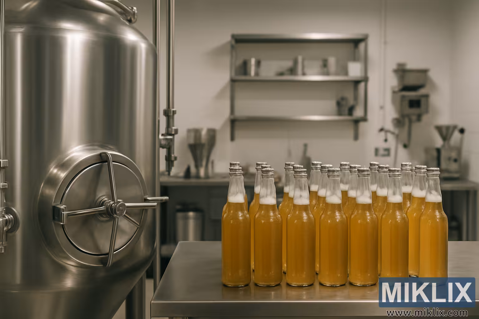Полірований бродильний бак з нержавіючої сталі та акуратно розкладені пивні пляшки розташовані в сучасному, добре освітленому робочому просторі пивоварні, підкреслюючи точність та майстерність.