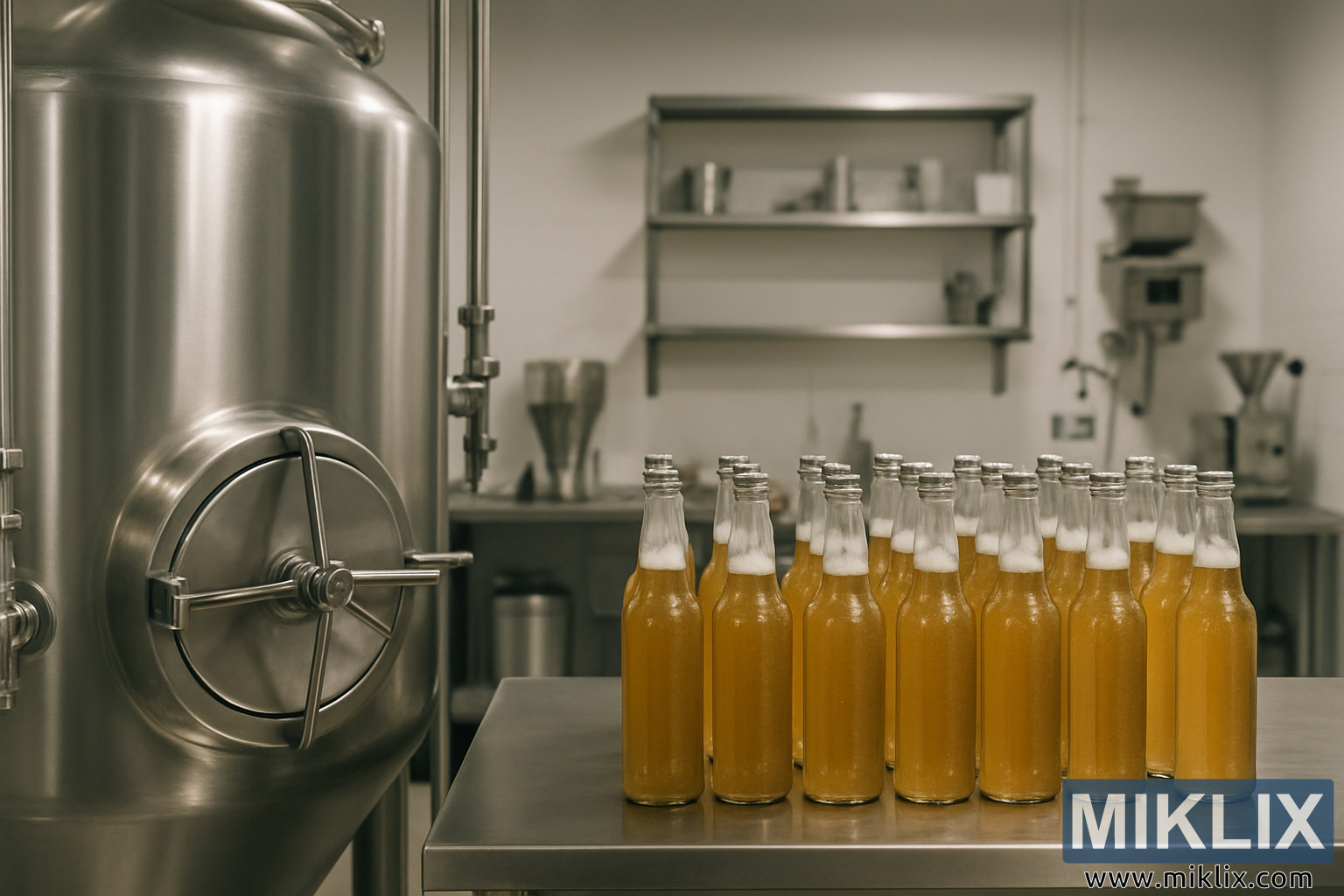 Посередині, на робочому столі з нержавіючої сталі, акуратно організована колекція прозорих скляних пляшок займає стіл з нержавіючої сталі. Кожна пляшка наповнена каламутною золотистою рідиною — пивом на стадії кондиціонування, — її газація м’яко піднімається тонкими струмками, що зникають у тонкому, кремовому шарі піни під герметичними кришками. Пляшки розташовані з дивовижною симетрією, їх рівномірна відстань між ними та стабільний рівень наповнення підсилюють відчуття дисципліни та точності, що визначає середовище. Теплий бурштиновий відтінок пива забезпечує єдиний помітний колірний контраст у сцені, виділяючись на тлі домінуючої сірої палітри полірованого металу та нейтральних промислових поверхонь.