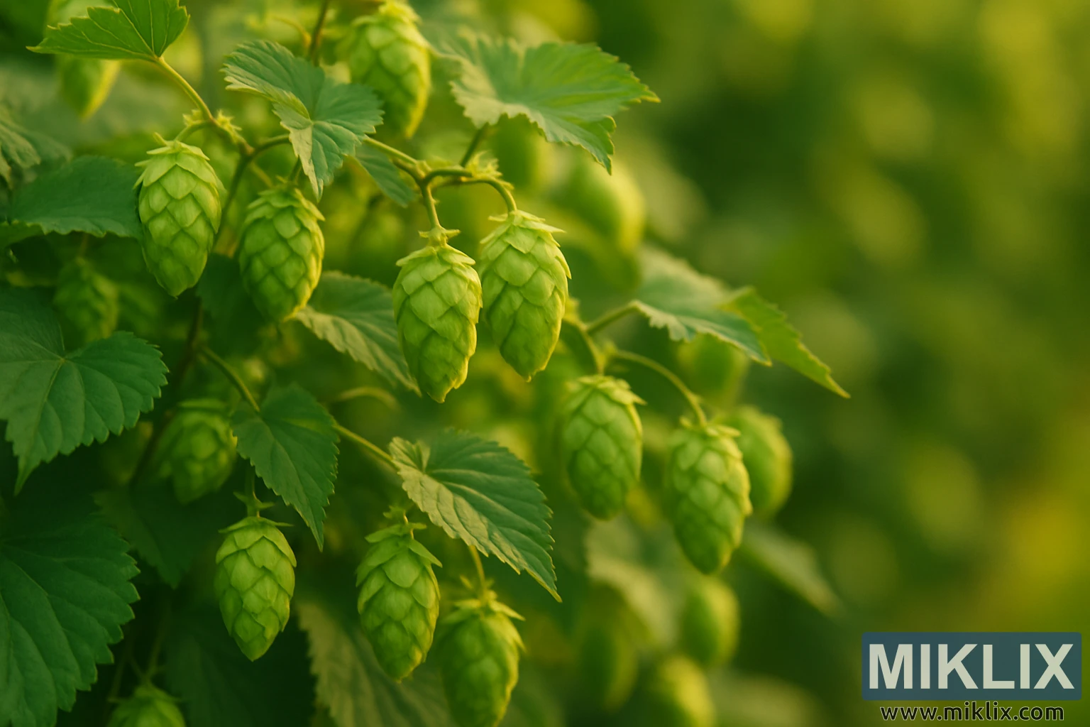 На зображенні зображено приголомшливий крупний план пишних шишок хмелю Рівака (Humulus lupulus), залитих м'яким сяйвом природного сонячного світла. Фотографія передає відчуття яскравості та органічної краси, коли лози хмелю розгортаються по кадру, їхні видовжені шишки звисають елегантними гронами. Кожна шишка хмелю – це шедевр із багатошарових, папероподібних приквітків, що перекриваються, як ніжні лусочки, а їхні зелені поверхні ледь помітно блищать від смолистих олій. Листя, що оточує шишки, широке, зубчасте та насичено-зелене, створюючи контрастний фон текстури та тону. Гра світла та тіні підкреслює дрібні деталі, а пізнє золотисте світло надає тепла та глибини всій композиції.