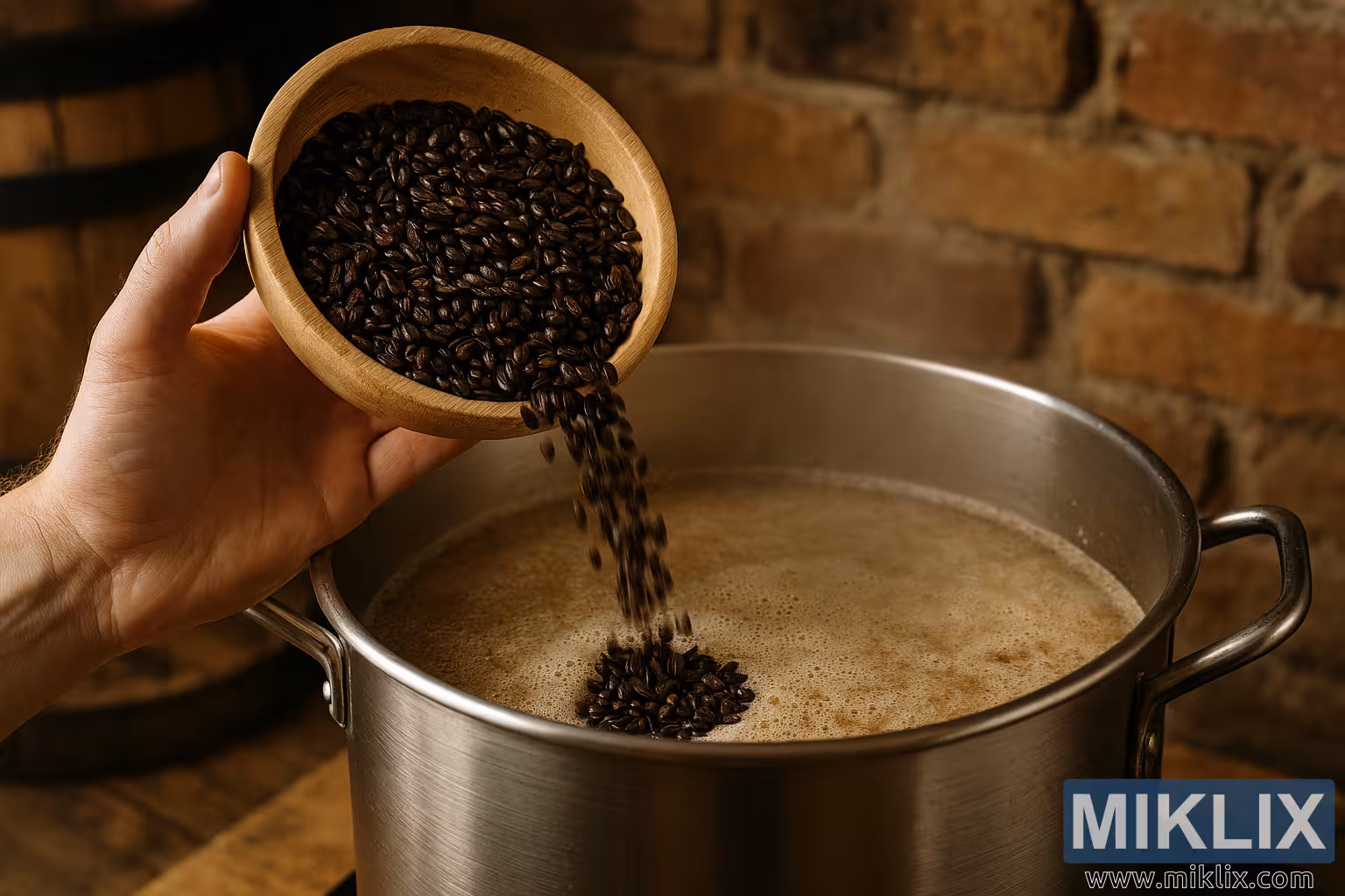 Зображення високої роздільної здатності, на якому показано додавання очищеного від лушпиння солоду Carafa до заторного котла в традиційній атмосфері домашнього пивоваріння з теплими, сільськими деталями.