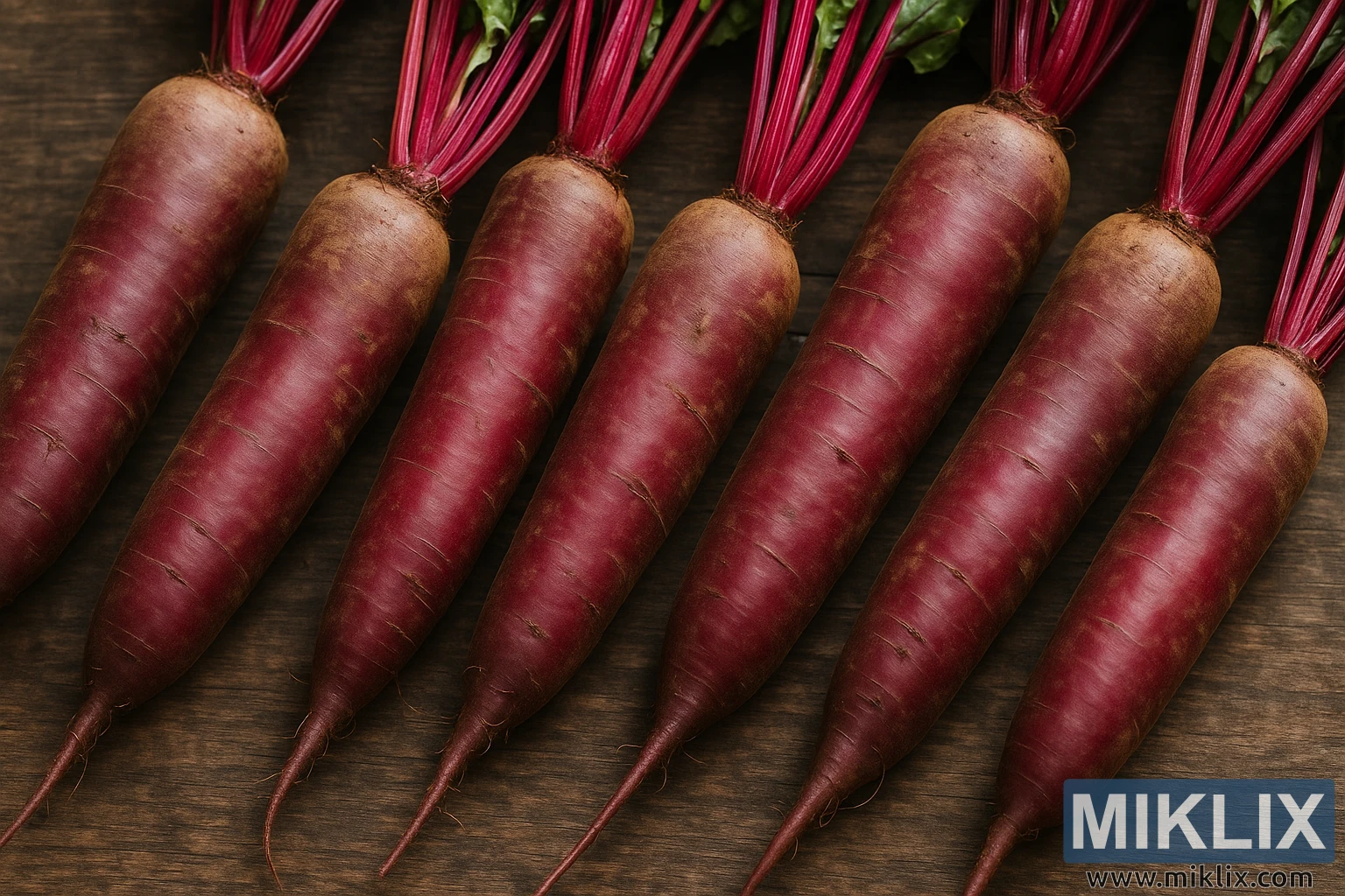 Прикріплені стебла створюють яскравий контраст, демонструючи яскраві пурпурові стебла, що переходять у пишне зелене листя одразу за верхнім краєм кадру. Хоча видно лише поверхню листя, його насичений колір та м’яко вигнуті форми додають сцені відчуття жвавості та свіжості. Взаємодія між сміливими червоно-фіолетовими тонами коренів та сільським коричневим дерев’яним фоном посилює візуальний ефект, привертаючи увагу глядача до повторюваного візерунка, утвореного майже ідентичними формами. Кожен буряк елегантно звужується до тонкого ниткоподібного кореня, підкреслюючи вражаючу геометрію сорту Cylindra та чітко відрізняючи його від більш поширених круглих форм буряків.