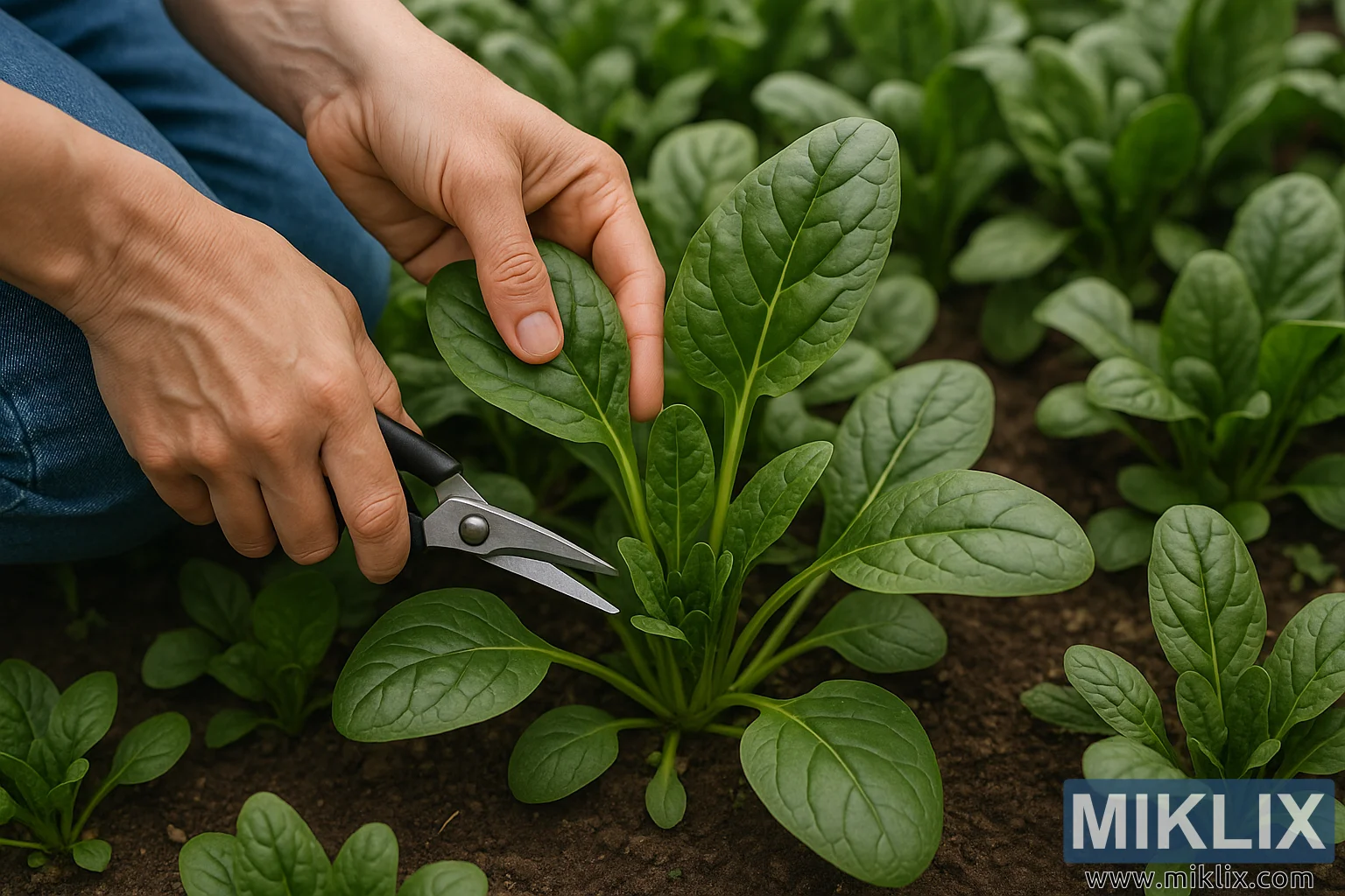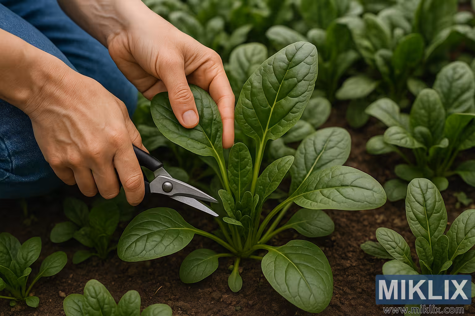 На зображенні зображено спокійний крупний план садівника з високою роздільною здатністю, який збирає шпинат у саду просто неба, що ілюструє сталий та ефективний метод вирощування. На передньому плані видно пару рук — чистих, але трохи обвітрених, що свідчить про досвід та турботу — які обережно тримають лівою рукою зрілий лист шпинату, а правою рукою тримають невеликі гострі секатори. Секатори розташовані трохи вище основи стебла листка за мить до того, як буде зроблено точний зріз. Руки та інструмент займають центральне місце в композиції, оточені пишним, насиченим зеленим листям здорових рослин шпинату.