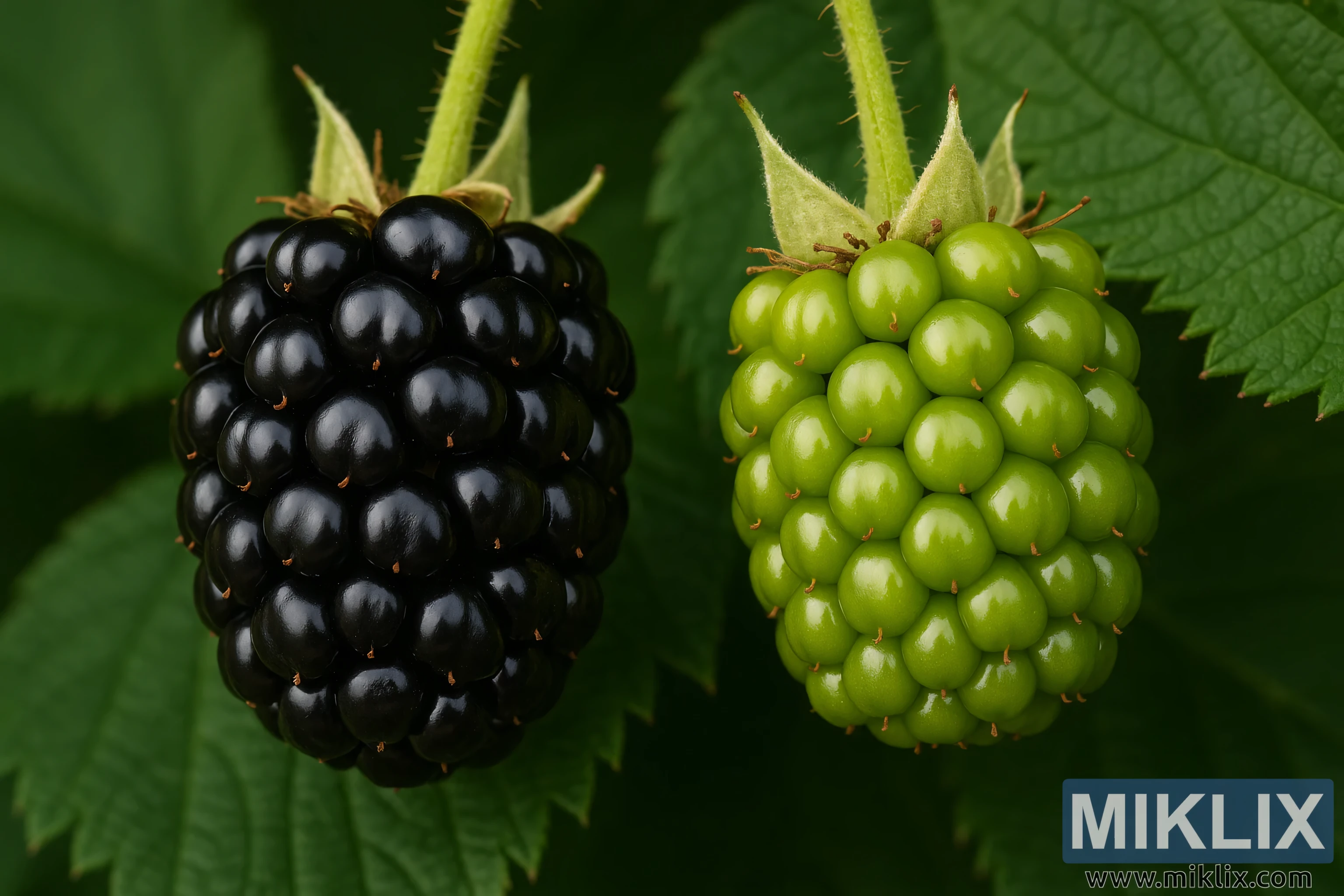Детальне макрознімок, що демонструє вражаючу різницю в кольорі та текстурі стиглої чорної ожини та нестиглої зеленої, обидві на тлі пишного зеленого листя.
