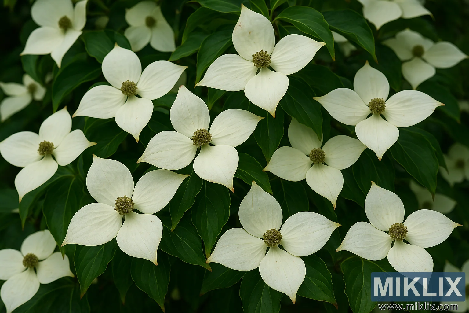 یہ ہائی ریزولوشن زمین کی تزئین کی تصویر ایک شاندار ہائبرڈ ڈاگ ووڈ (کورنس ہائبرڈ) کو پوری طرح سے کھینچتی ہے، جو اس کے سجاوٹی خوبصورتی اور مضبوط بیماریوں کے خلاف مزاحمت کے مشہور امتزاج کی مثال دیتی ہے۔ ساخت نباتاتی اور فنکارانہ دونوں طرح کی ہے، جس میں پھولوں کے گھنے جھرمٹ کو دکھایا گیا ہے جس کے چاروں طرف بھرپور سبز پودوں ہیں۔ ہر پھول نما ڈھانچہ چار بڑے، کریمی سفید بریکٹس پر مشتمل ہوتا ہے—تکنیکی طور پر تبدیل شدہ پتے—جو چھوٹے، حقیقی پھولوں کے مرکزی جھرمٹ کے گرد کراس جیسی شکل بناتے ہیں۔ بریکٹ سروں کی طرف تھوڑا سا اشارہ کرتے ہیں، ٹھیک ٹھیک رگوں کے ساتھ جو مرکز سے نکلتی ہیں، ہر ایک کو نرم ساخت اور گہرائی کا ایک نازک احساس دیتا ہے۔ ان کا سفید رنگ گہرے، چمکدار سبز پتوں سے خوبصورتی سے متصادم ہے، جن کی سطح قدرے غیر منقطع ہوتی ہے اور کتے کی لکڑیوں کی طرح واضح وینیشن ہوتی ہے۔