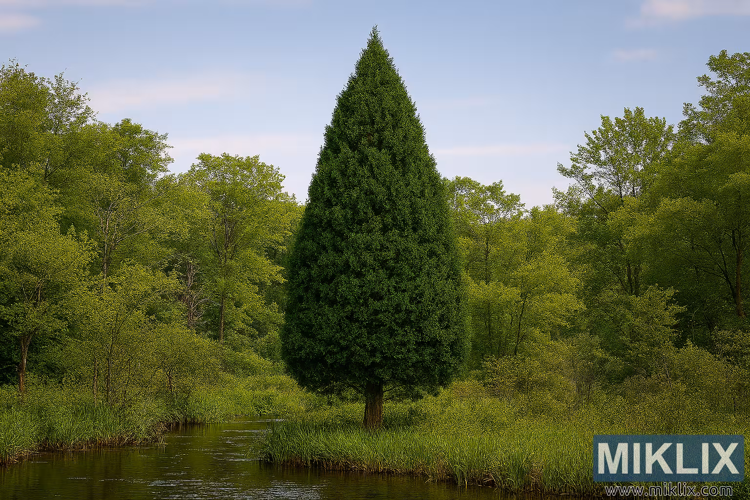 اوپر، آسمان ایک نرم نیلا ہے جس میں بکھرے ہوئے بادل ہیں۔ سورج کی روشنی چھتری کے ذریعے فلٹر کرتی ہے، جنگل کے فرش پر چھائی ہوئی چھائیاں ڈالتی ہے اور Arborvitae کے پودوں کو ہلکی، پھیلی ہوئی چمک کے ساتھ روشن کرتی ہے۔ روشنی قدرتی اور متوازن ہے، چھال، پتی اور پانی کی ساخت کو بغیر کسی سخت تضاد کے بڑھاتی ہے۔