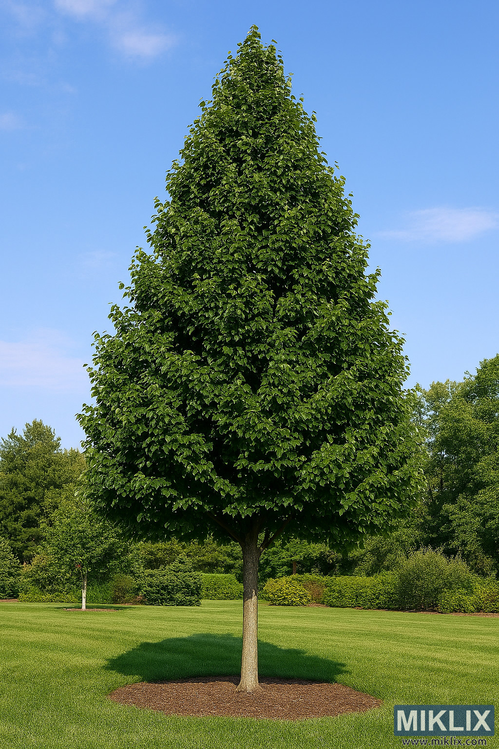 مجموعی طور پر ساخت پر سکون اور منظم ہے، باغیچے کے باقاعدہ ڈیزائن میں گرین اسپائر لنڈن کی مناسبیت کو ظاہر کرنے کے لیے مثالی ہے۔ اس کی سیدھی نشوونما کی عادت، گھنے پودوں، اور سڈول تاج اسے ایلیوں، فوکل پوائنٹس، یا آرکیٹیکچرل پودے لگانے کے لیے قدرتی انتخاب بناتے ہیں۔ یہ تصویر نہ صرف درخت کی نباتاتی خصوصیات کا جشن مناتی ہے بلکہ اس کے کردار کو ایک زندہ مجسمے کے طور پر ایک کیوریٹڈ زمین کی تزئین میں بھی ظاہر کرتی ہے۔