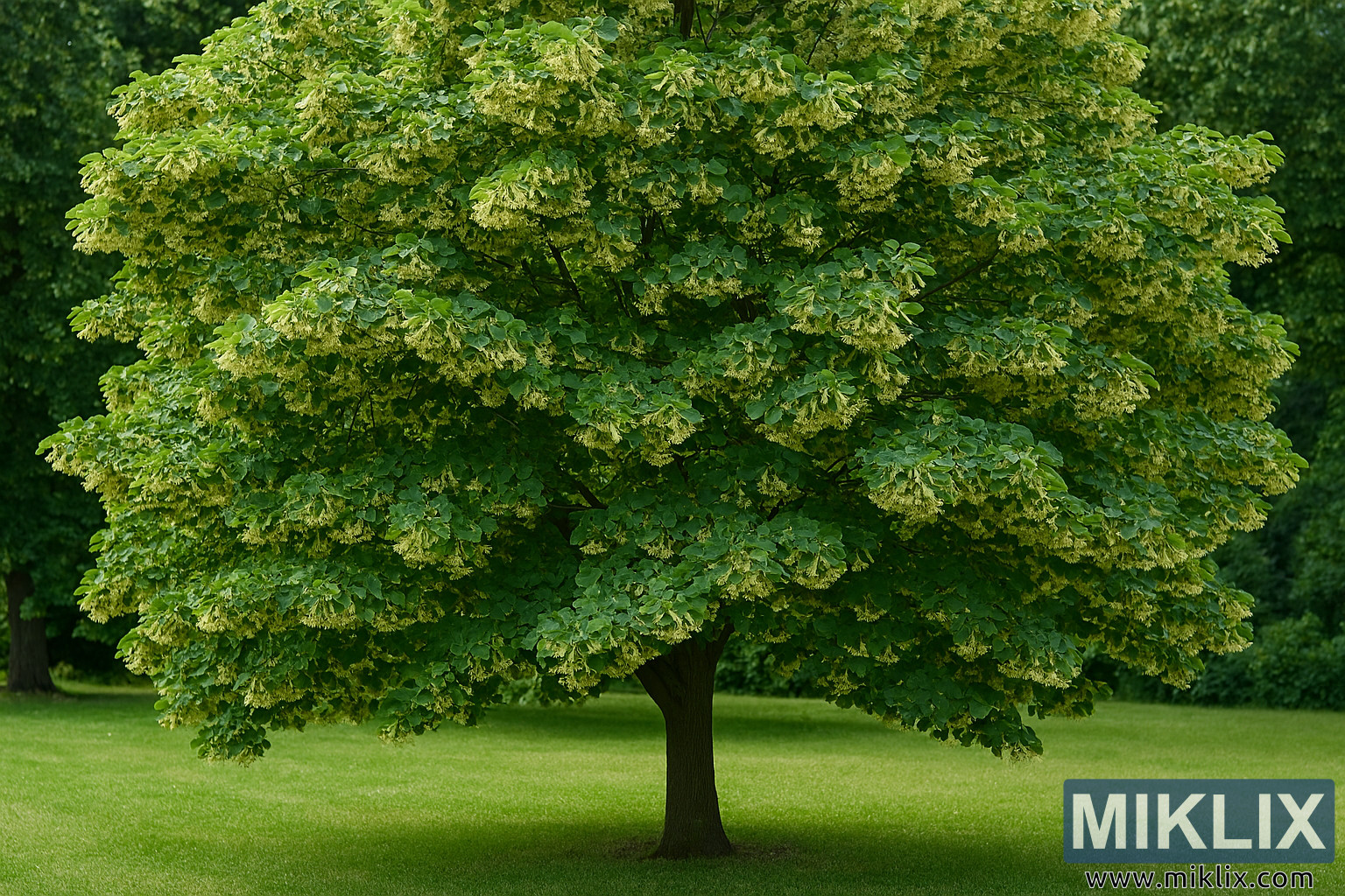 اس تصویر میں ایک بالغ لنڈن کے درخت (ٹیلیا) کو پوری طرح کھلتے ہوئے دکھایا گیا ہے، جو احتیاط سے رکھے ہوئے باغیچے کے منظر نامے میں مرکز کے طور پر کھڑا ہے۔ درخت کی کمانڈنگ موجودگی کی تعریف اس کی چوڑی، سڈول چھتری سے ہوتی ہے، جو قریب قریب کامل گنبد میں باہر کی طرف پھیلا ہوا ہے، جو ایک بصری توازن پیش کرتا ہے جو شاندار اور پر سکون ہے۔ پتے گھنے اور متحرک ہوتے ہیں، دل کی شکل کے ہزاروں پتوں پر مشتمل ہوتے ہیں جن کے کنارے باریک سیر ہوتے ہیں۔ ان کی سرسبز و شاداب رنگت چھتری میں بالکل مختلف ہوتی ہے، سورج کی روشنی کے کناروں کے قریب ہلکے ٹونز اور سایہ دار اندرونی حصے میں گہری سبزیاں، روشنی اور ساخت کا ایک متحرک تعامل پیدا کرتی ہیں۔