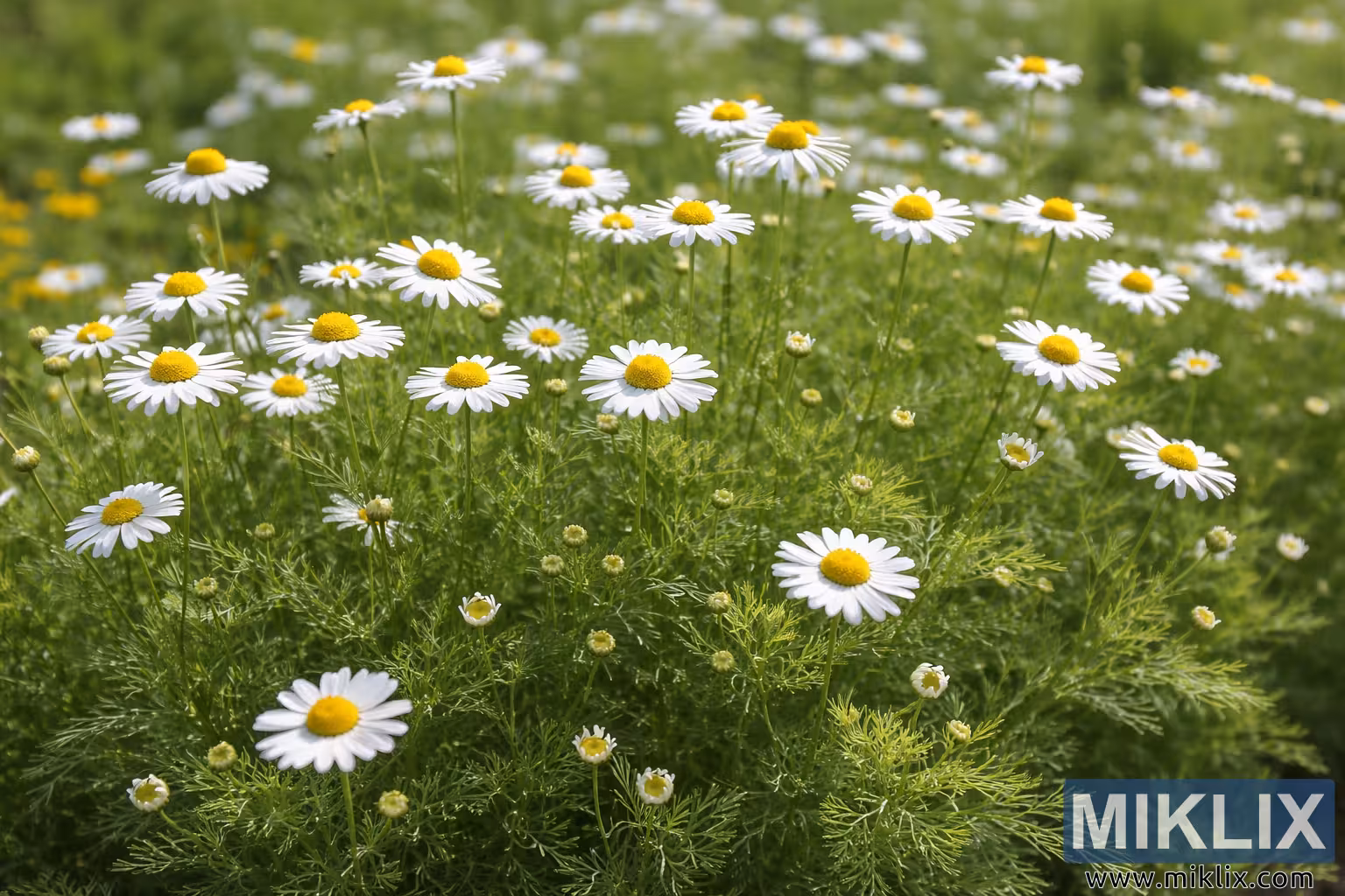 سفید پنکھڑیوں کے ساتھ جرمن کیمومائل کے پھولوں کی ہائی ریزولوشن لینڈ سکیپ کی تصویر جس میں سرسبز سبز پودوں میں بڑھتے ہوئے پیلے مراکز ہیں، جو قدرتی دن کی روشنی میں قید ہیں۔