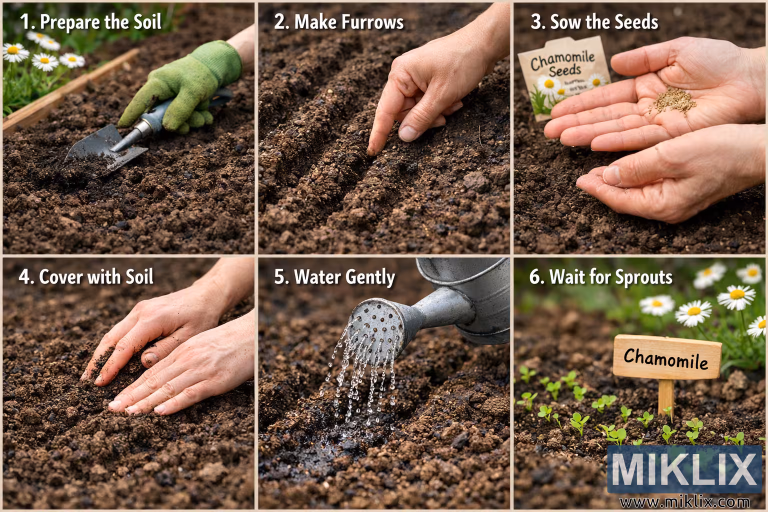 ہائی ریزولوشن مرحلہ وار فوٹو گرافی گائیڈ یہ بتاتا ہے کہ باغ کی مٹی میں کیمومائل کے بیج کیسے لگائے جائیں، تیاری اور بوائی سے لے کر پانی دینے اور انکرنے تک۔