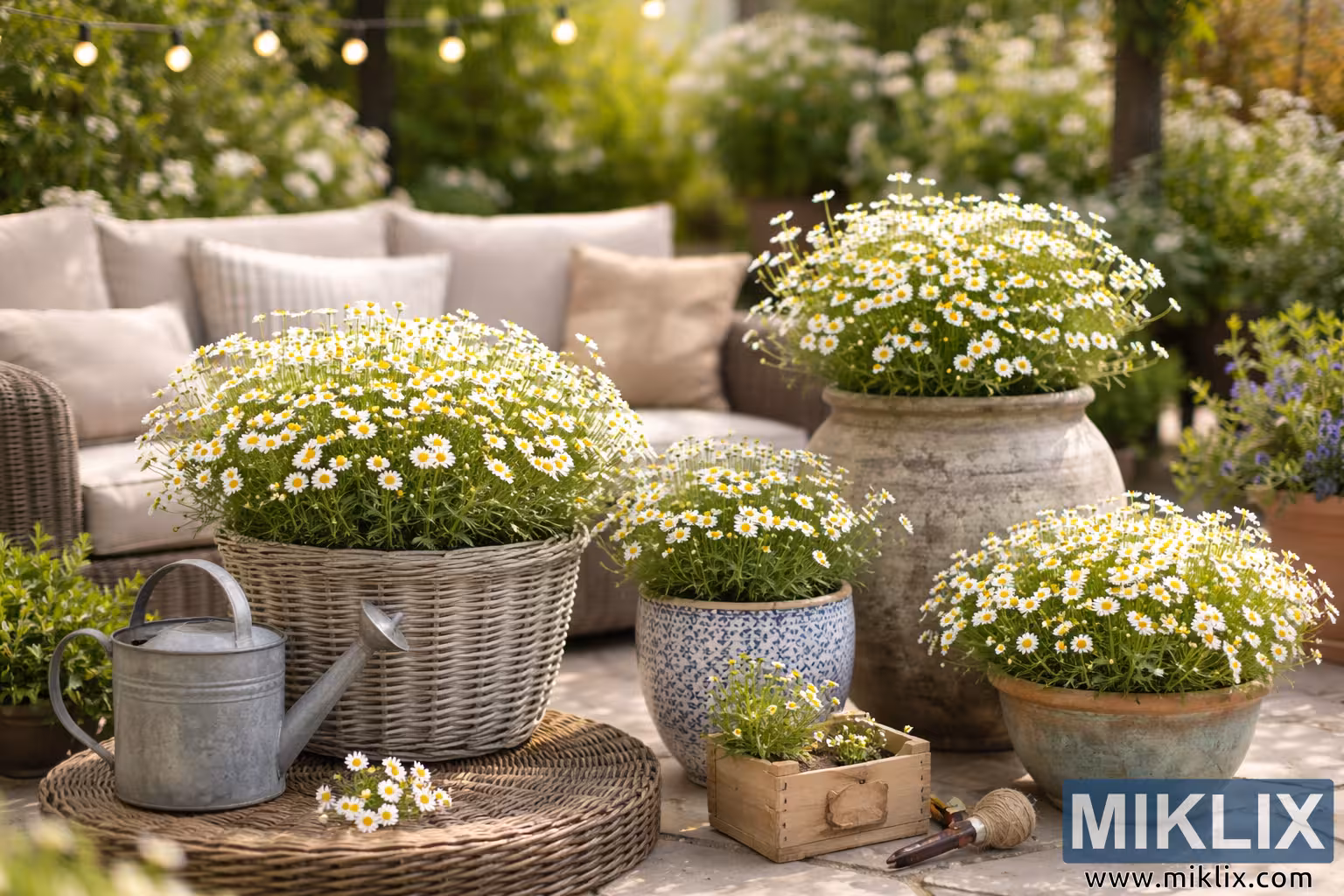 Chamomile in Decorative Containers on a Sunlit Patio