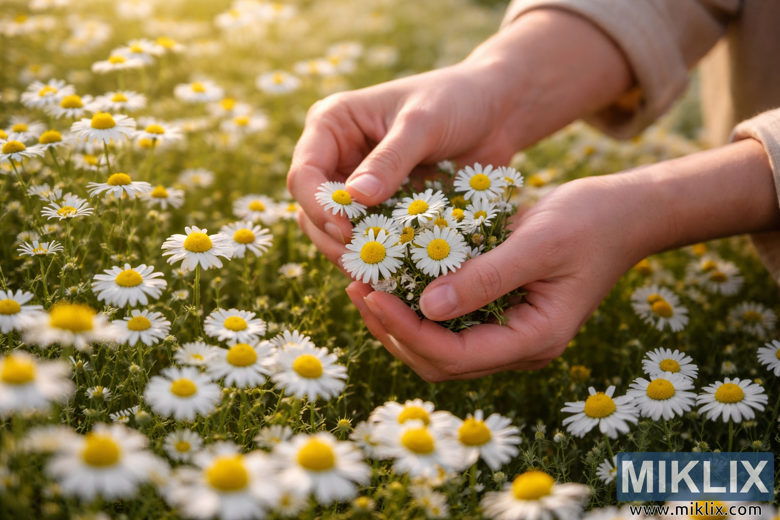 سورج کی روشنی والے کھیت میں کھلنے کے بہترین مرحلے پر کیمومائل کے پھولوں کی احتیاط سے کٹائی کرتے ہاتھوں کی قریبی تصویر، قدرتی کاشتکاری، جڑی بوٹیوں کی روایت اور فطرت سے تعلق کی علامت ہے۔