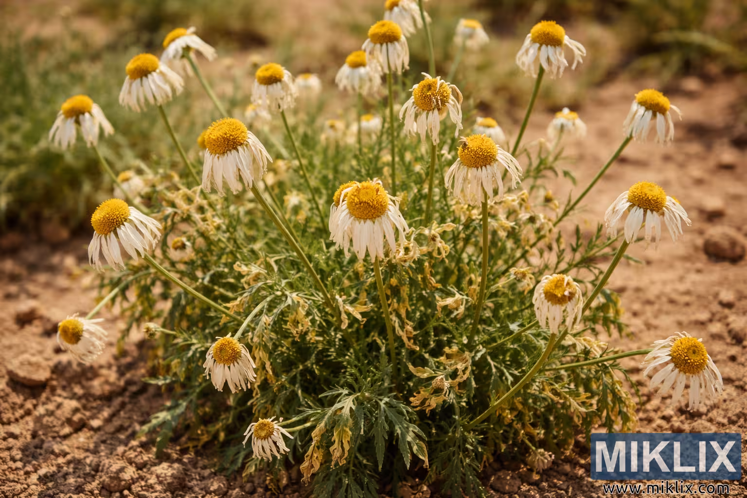 تصویر میں ایک کیمومائل کا پودا دکھایا گیا ہے جو ایک بیرونی ماحول میں تیز سورج کی روشنی میں بڑھ رہا ہے، واضح طور پر گرمی کے تناؤ اور پانی کی کمی کی علامات کو ظاہر کرتا ہے۔ پلانٹ کو مرکزی طور پر فریم میں رکھا گیا ہے اور زمین کی تزئین کی واقفیت میں اس کی تصویر کشی کی گئی ہے، جس سے ارد گرد کے ماحول کو بصری سیاق و سباق فراہم کیا جا سکتا ہے۔ ایک سے زیادہ کیمومائل پھول باریک تقسیم شدہ پودوں کے گھنے جھرمٹ سے پتلے سبز تنوں پر ابھرتے ہیں۔ پھولوں میں نمایاں پیلے، گنبد نما مراکز ہوتے ہیں، جب کہ ان کی سفید پنکھڑیاں باہر کی طرف نکلنے کے بجائے نیچے کی طرف لٹکتی ہیں، جو کہ ضرورت سے زیادہ گرمی کی وجہ سے مرجھانے کا ایک کلاسک اشارہ ہے۔ بہت سی پنکھڑیاں لنگڑا اور ہلکی سی گھمائی ہوئی نظر آتی ہیں، جن میں سے کچھ سروں پر ہلکی بھوری یا خشکی دکھاتی ہیں، جو کہ زیادہ درجہ حرارت اور ناکافی نمی کے طویل عرصے تک نمائش کا مشورہ دیتی ہیں۔