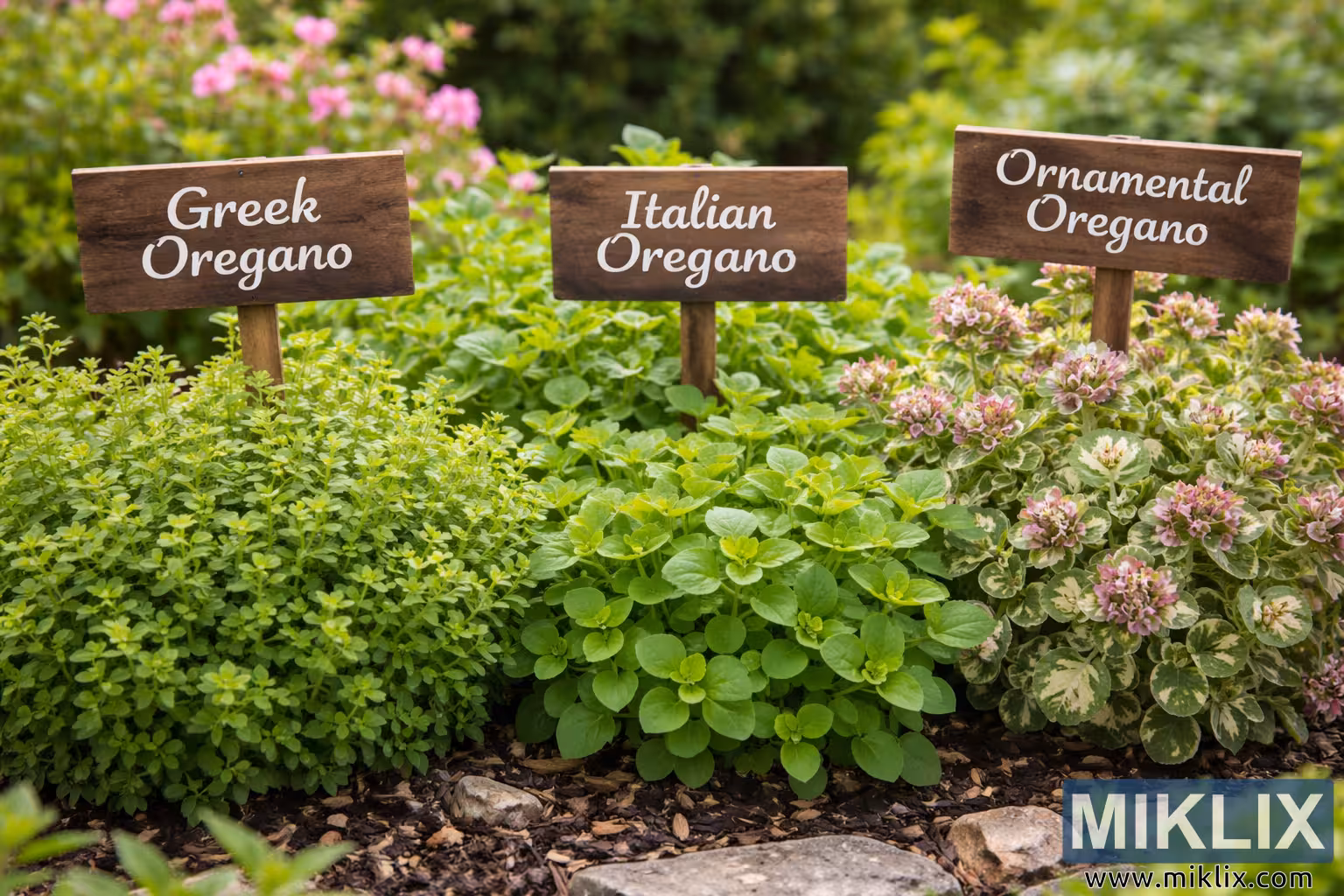 تصویر زمین کی تزئین کی واقفیت میں ایک روشن، احتیاط سے تیار کردہ باغیچے کا منظر پیش کرتی ہے، جسے ایک ہائی ریزولوشن تصویر کی وضاحت اور گہرائی کے ساتھ لیا گیا ہے۔ اوریگانو کی تین الگ الگ قسمیں ایک کاشت شدہ باغیچے کے بستر میں ساتھ ساتھ بڑھتی ہوئی دکھائی گئی ہیں، ہر ایک کی واضح طور پر پودوں کے سامنے لکڑی کے ایک چھوٹے سے دہاتی نشان سے شناخت کی گئی ہے۔ بائیں سے دائیں، نشانات میں "یونانی اوریگانو،" "اطالوی اوریگانو،" اور "آرنمینٹل اوریگانو" لکھا گیا ہے، جو نرم سفید حروف میں پینٹ کیا گیا ہے جو گرم، موسمی لکڑی سے نرمی سے متصادم ہے۔