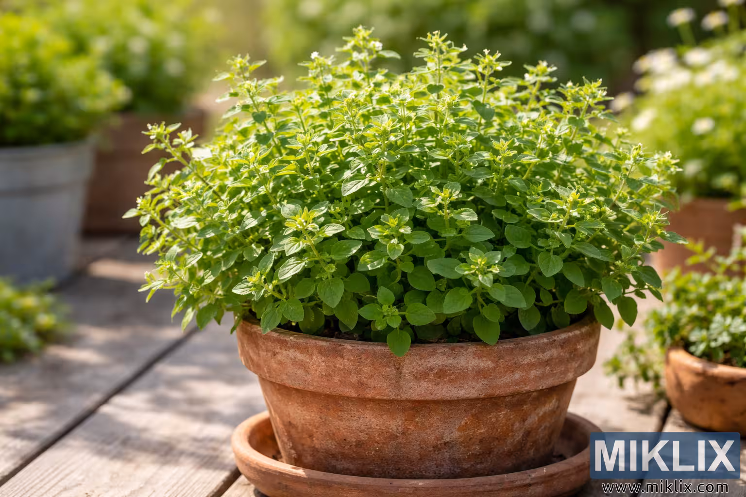 تصویر: اطالوی اوریگانو ایک ٹیراکوٹا کنٹینر میں اگ رہا ہے۔