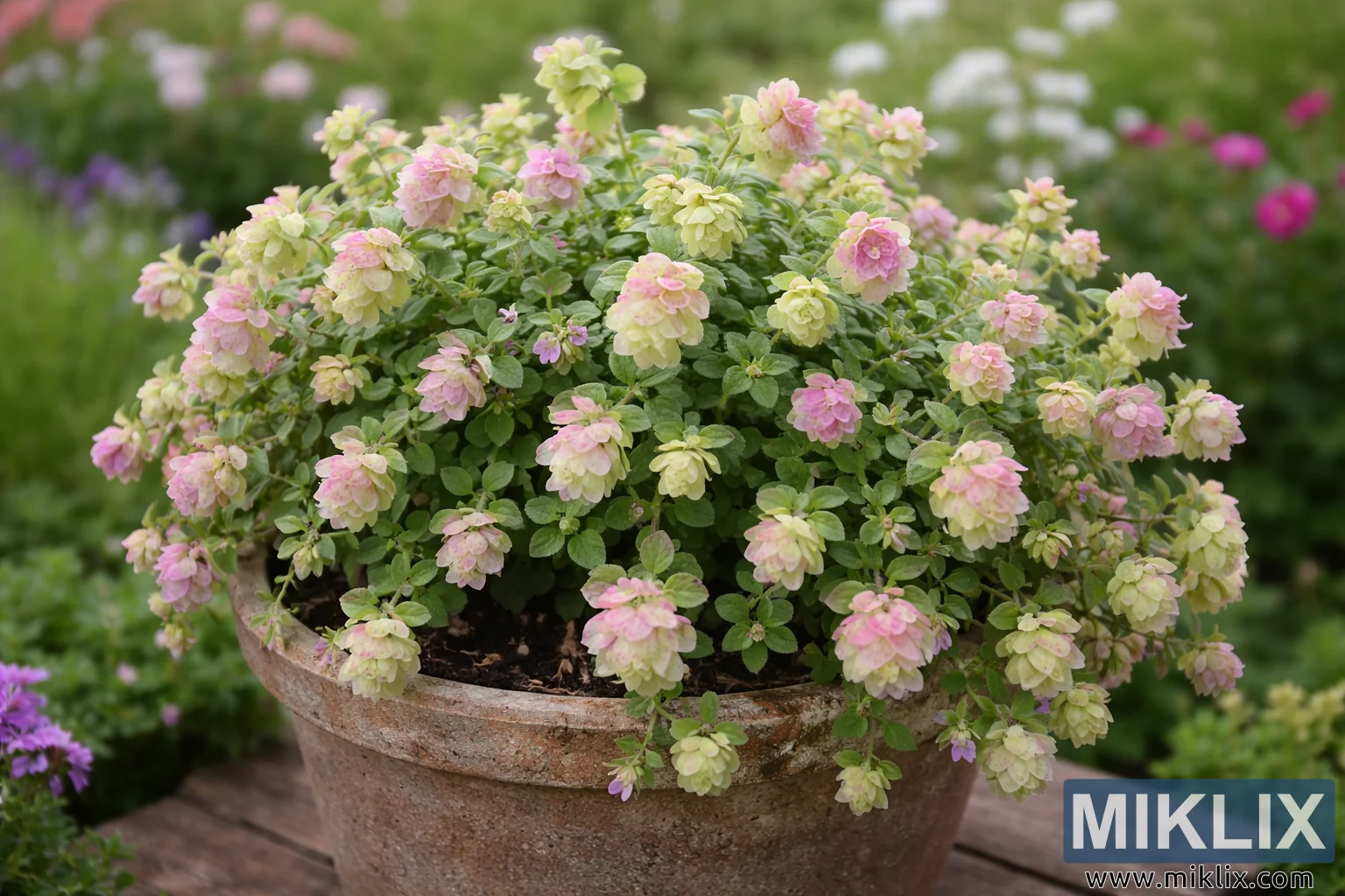 ٹیراکوٹا کنٹینر میں اگنے والے آرائشی اوریگانو پلانٹ کی تصویر، جس میں نرم سبز اور گلابی بریکٹ اور ایک دھندلا باغی پس منظر دکھایا گیا ہے، جو باغبانی اور پودوں کے ڈیزائن کے مواد کے لیے مثالی ہے۔