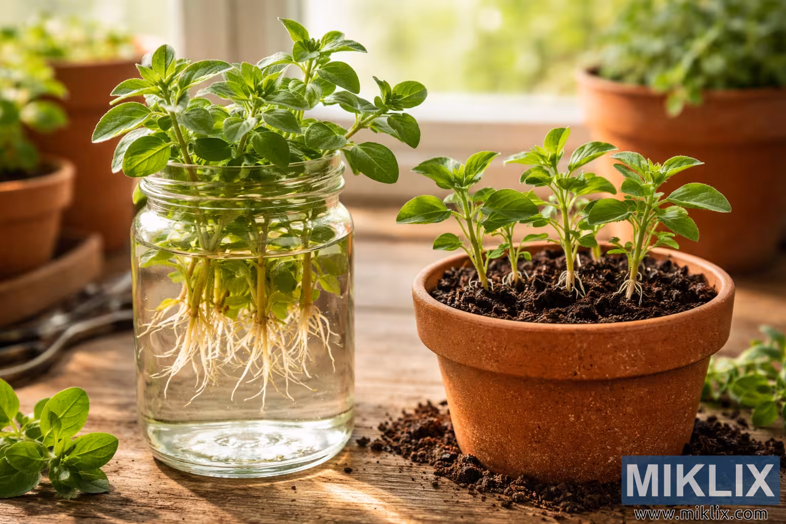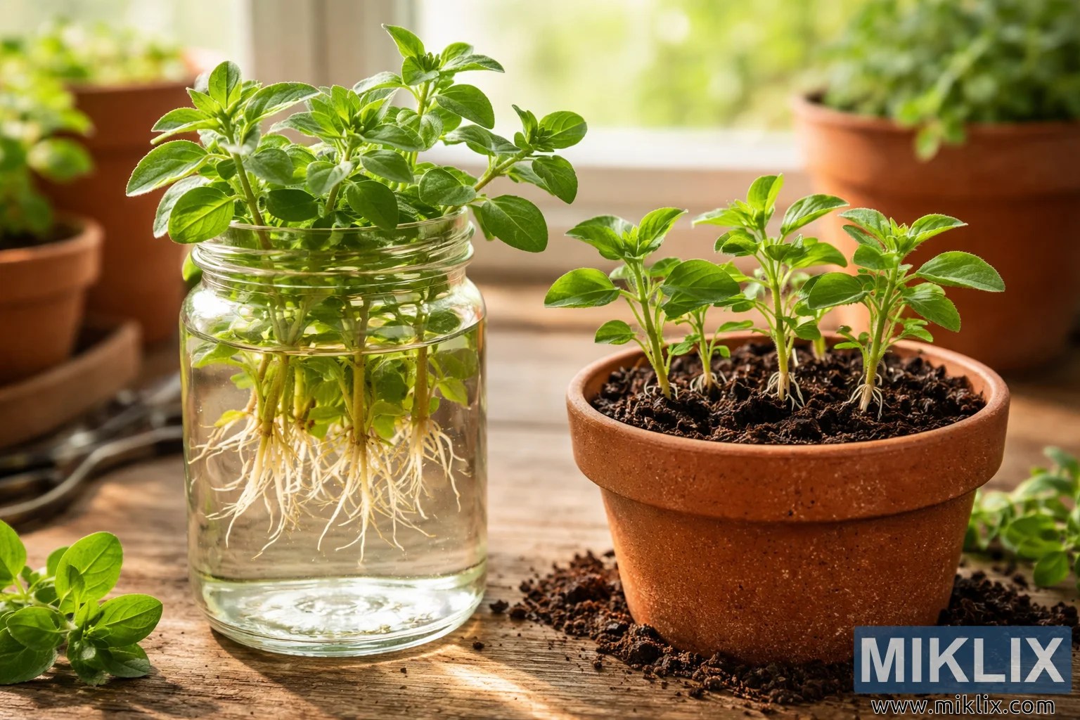 ہائی ریزولوشن والی تصویر جس میں اوریگانو کے تنے کی کٹنگیں پانی اور مٹی میں پھیلتی ہوئی دکھائی دیتی ہیں، گھر میں جڑی بوٹیوں کو جڑ سے اکھاڑ پھینکنے کے دو آسان طریقے بیان کرتی ہیں۔