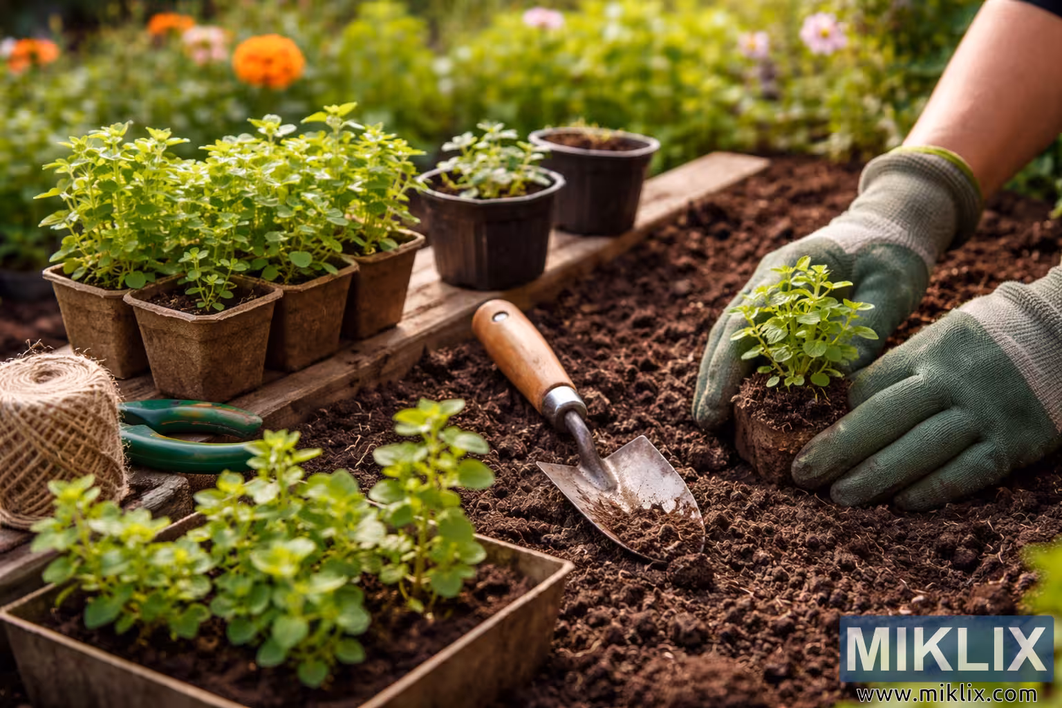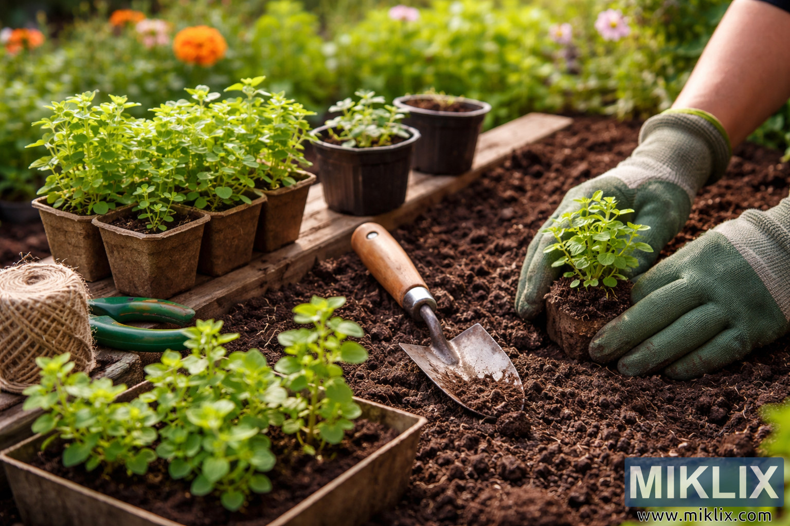 باغیچے کا ایک تفصیلی منظر جس میں اوریگانو کے پودوں کو ایک تیار شدہ باغیچے میں پیوند کیا جا رہا ہے، دستانے والے ہاتھوں، مٹی، اور گرم قدرتی روشنی میں باغبانی کے اوزار۔