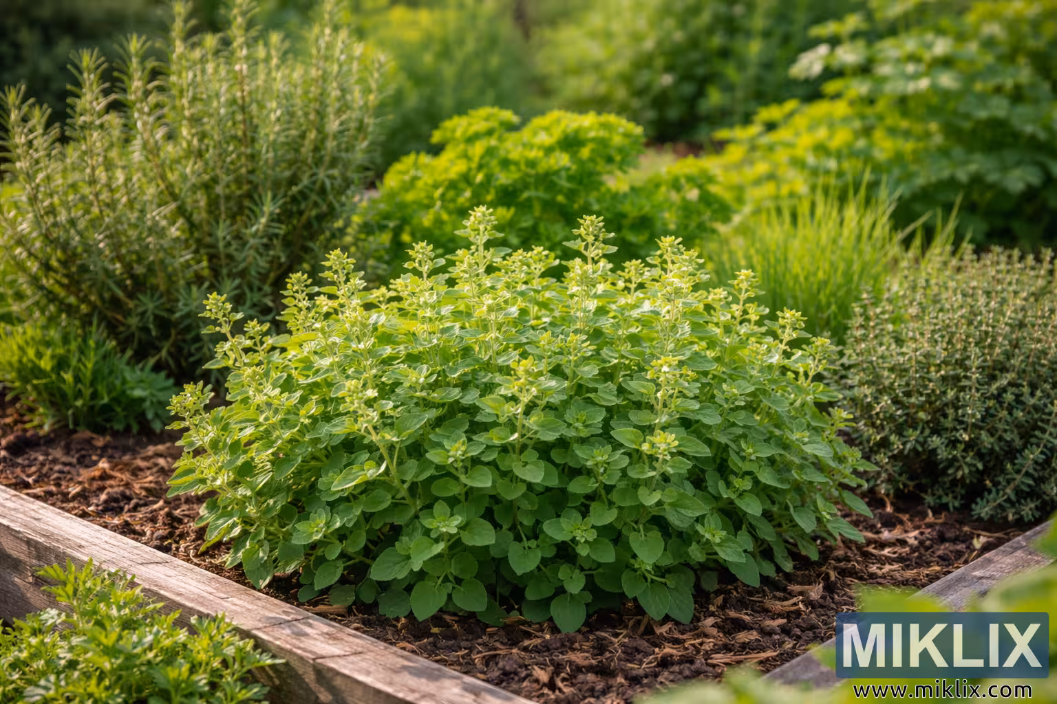 یہ تصویر ایک سرسبز، سورج کی روشنی والی جڑی بوٹیوں کے باغ کو پیش کرتی ہے جسے لکڑی کے باغیچے کے ایک اٹھائے ہوئے بستر میں ترتیب دیا گیا ہے، جسے وسیع، زمین کی تزئین پر مبنی ساخت میں دیکھا گیا ہے۔ فریم کے بیچ میں، ایک پھلتا پھولتا اوریگانو کا پودا منظر پر حاوی ہے، جو متحرک سبز پودوں کا ایک گھنا، گول ٹیلا بناتا ہے۔ اوریگانو کے پتے چھوٹے سے درمیانے سائز کے ہوتے ہیں، بیضوی شکل کے ہوتے ہیں اور قدرے بناوٹ والے ہوتے ہیں، ایک نرم دھندلی سطح کے ساتھ جو روشنی کو تیزی سے منعکس کرنے کے بجائے آہستہ سے پکڑتی ہے۔ کئی سیدھے تنے پودے کے مرکزی جسم کے اوپر اٹھتے ہیں، جن میں سے ہر ایک پر ہلکی سبز کلیوں کے جھرمٹ ہوتے ہیں جو جلد پھول آنے کا مشورہ دیتے ہیں، عمودی دلچسپی اور قدرتی نشوونما اور توانائی کا احساس شامل کرتے ہیں۔