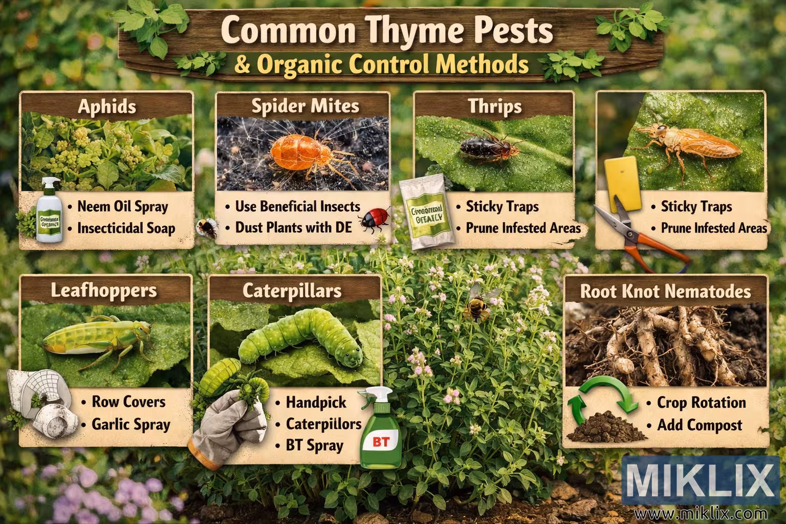 تعلیمی انفوگرافک عام تھائیم کیڑوں اور مؤثر نامیاتی کنٹرول کے طریقوں کی وضاحت کرتا ہے، بشمول نیم کا تیل، فائدہ مند کیڑے، فصل کی گردش، اور ہاتھ سے چننا، جو گھریلو باغبانوں اور پائیدار جڑی بوٹیوں کی دیکھ بھال کے لیے ڈیزائن کیا گیا ہے۔