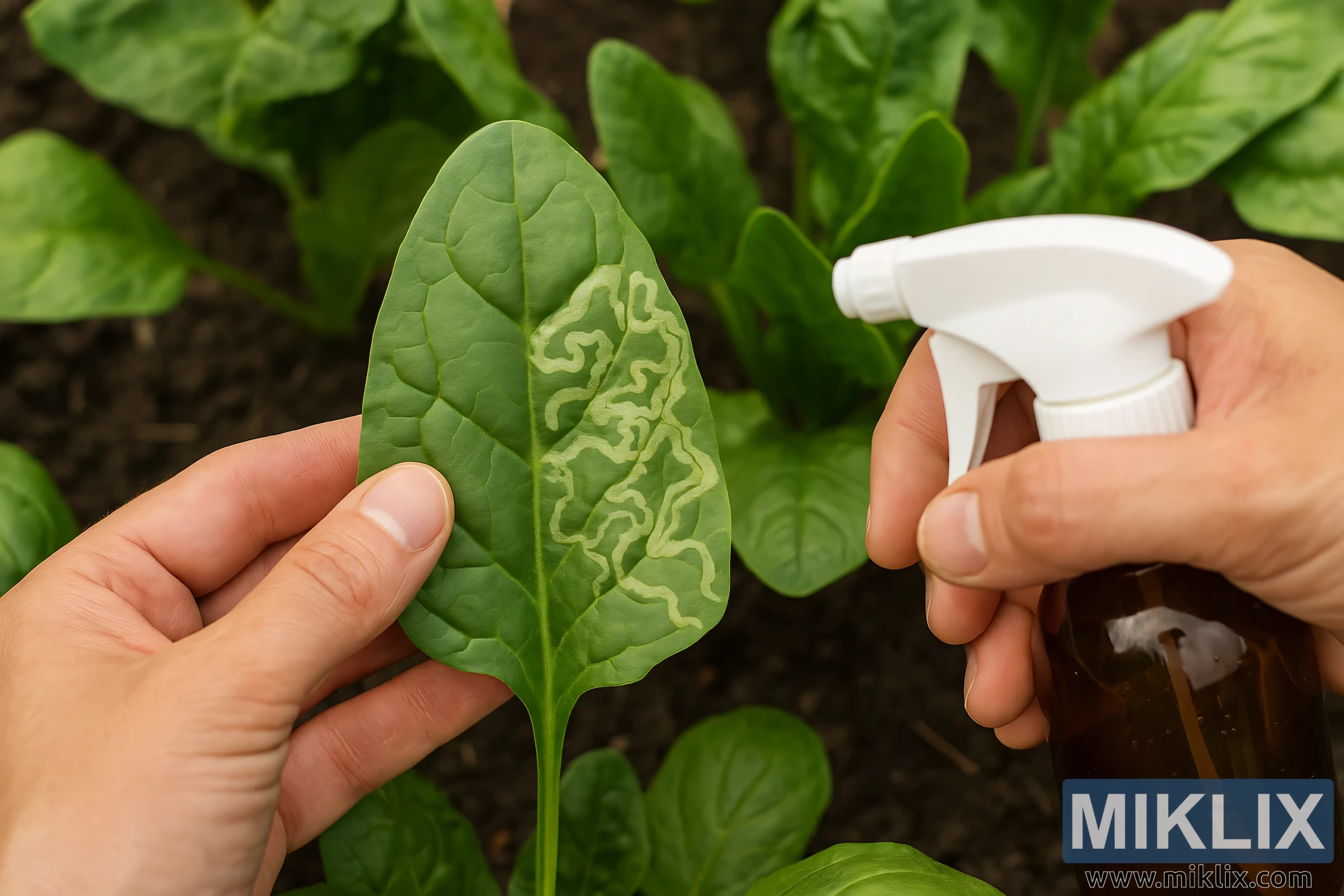 تصویر میں ایک روشن اور تعلیمی لمحے کی تصویر کشی کی گئی ہے جو پالک کے پتوں پر پتوں کی کان کنی کے انفیکشن سے وابستہ مسئلہ اور حل دونوں کو اجاگر کرتی ہے۔ پیش منظر میں، ایک شخص کے ہاتھ تیز تفصیل سے دکھائے گئے ہیں- ایک نے پالک کی ایک پتی کو آہستہ سے پکڑا ہوا ہے، جبکہ دوسرے کے پاس سفید نوزل سے لیس ایک چھوٹی امبر رنگ کی اسپرے کی بوتل ہے۔ پالک کی پتی ہی پتوں کی کھدائی کو پہنچنے والے نقصان کی کلاسیکی ناگنی پگڈنڈیوں کی نمائش کرتی ہے، جس کی خصوصیت پیلی، سمیٹتی سرنگوں کی ہوتی ہے جو سبز بافتوں کے ذریعے سانپ کو پھنساتی ہے۔ یہ فاسد راستے لاروا کی وجہ سے ہوتے ہیں جو پتے کی اوپری اور نچلی سطحوں کے درمیان گھس جاتے ہیں، اندرونی خلیات کو کھانا کھلاتے ہیں اور ان کے گزرنے کا واضح ثبوت چھوڑ دیتے ہیں۔ نقصان کے علاوہ پتی صحت مند دکھائی دیتی ہے جو جلد پتہ لگانے اور فوری مداخلت کی تجویز کرتی ہے۔