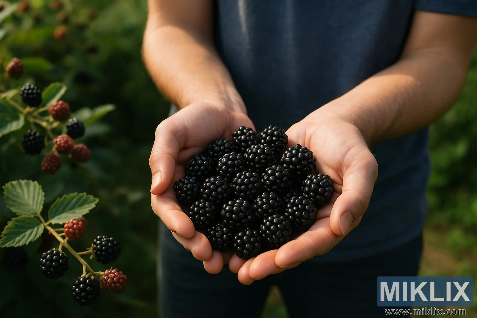 ایک قریبی تصویر جس میں تازہ کٹی ہوئی بلیک بیری کو احتیاط سے سنبھالتے ہوئے دکھایا گیا ہے، جسے ہاتھوں میں ہری پتوں اور پکنے والے بیر کے سرسبز پس منظر کے خلاف کپڑا ہوا ہے۔