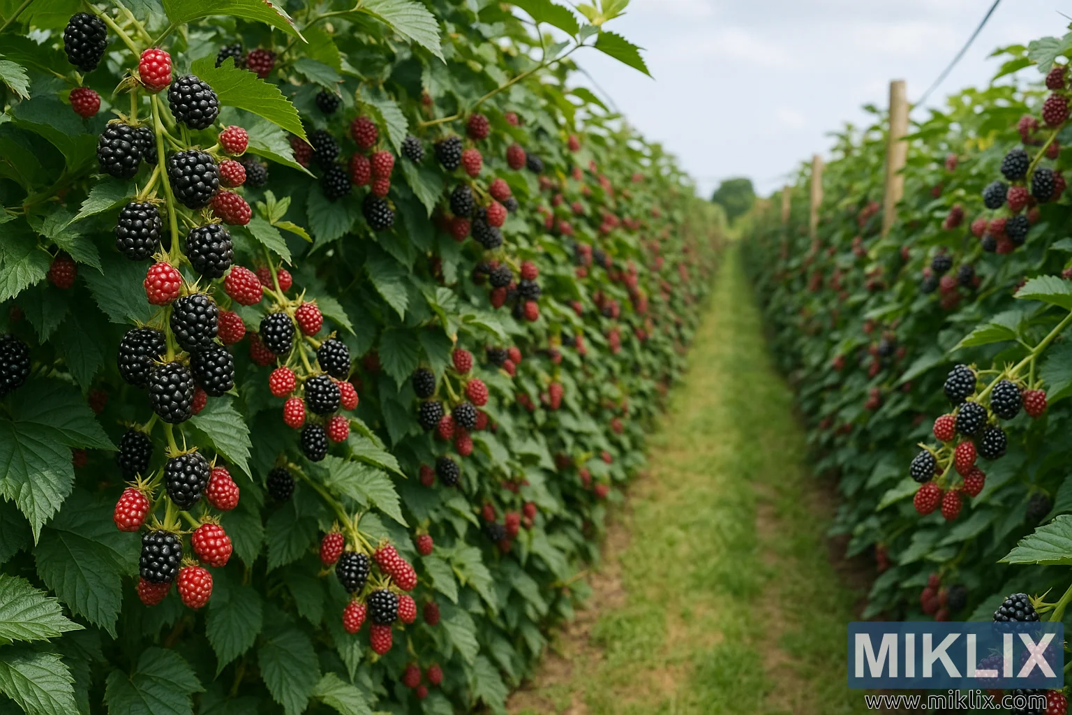 ایک فروغ پزیر بلیک بیری فارم اعلیٰ پیداواری تکنیک کا مظاہرہ کرتا ہے، جس میں احتیاط سے رکھے ہوئے باغ میں پکے ہوئے بیر کے ساتھ سرسبز پودوں کی قطاریں ہوتی ہیں۔