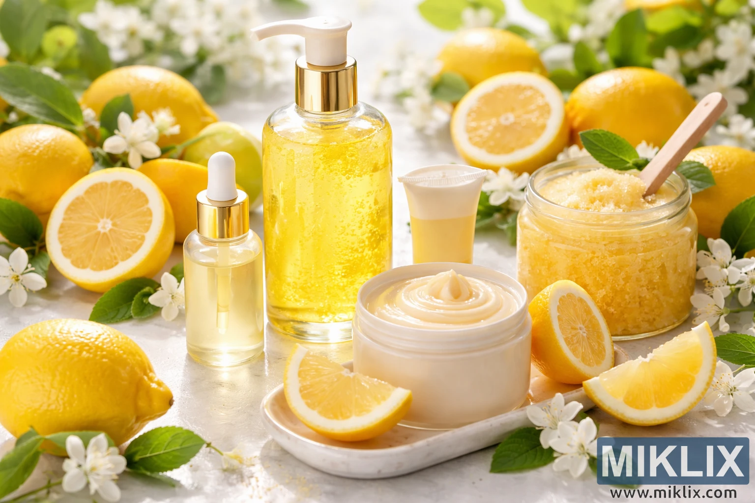 تازہ لیموں، لیموں کے ٹکڑوں، اور نباتاتی لہجوں کے ساتھ لیموں پر مبنی خوبصورتی اور سکن کیئر پروڈکٹس کی ہائی ریزولیوشن تصویر، جو قدرتی، تازگی بخش تندرستی کی خوبصورتی کا اظہار کرتی ہے۔