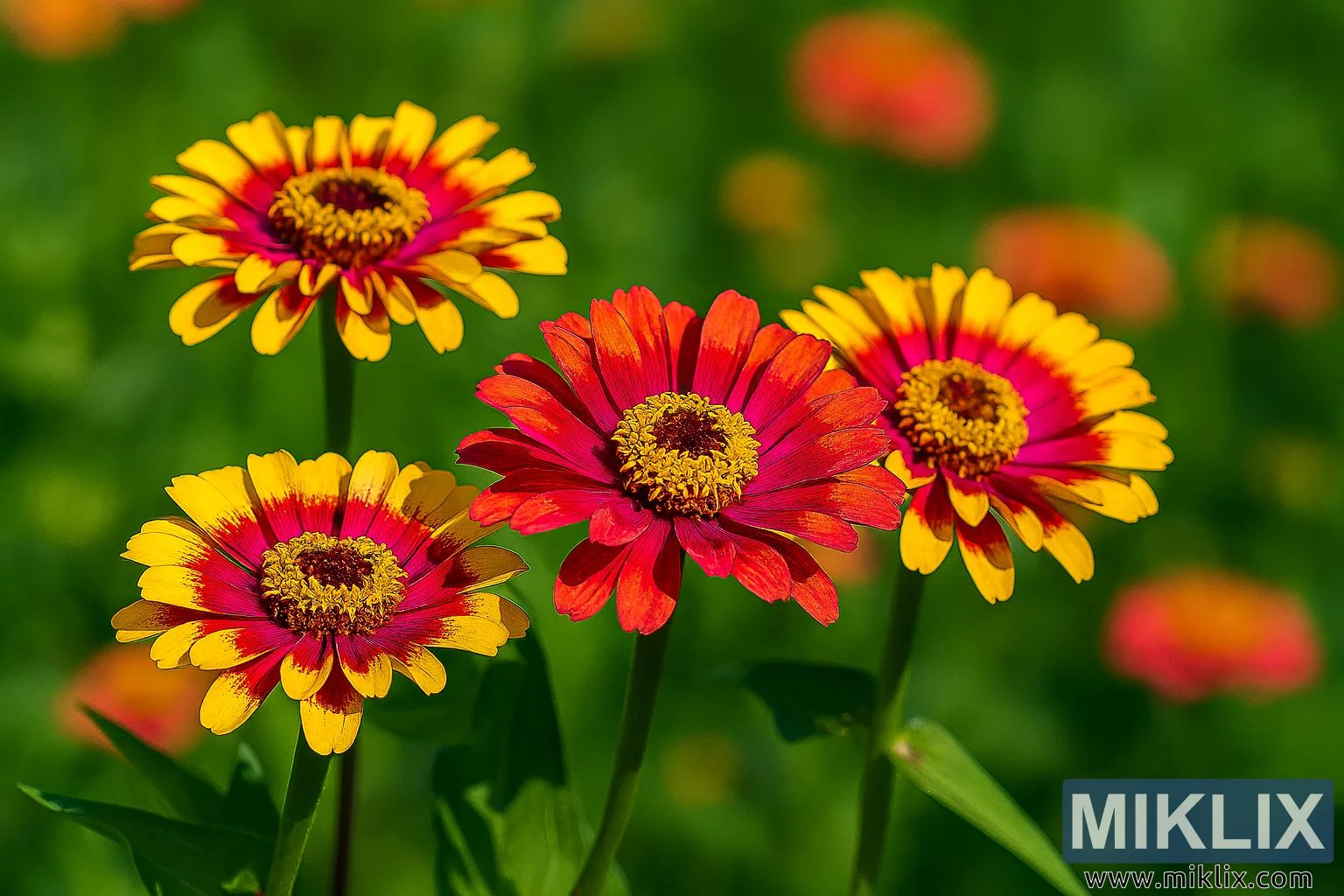 یہ اعلی ریزولیوشن زمین کی تزئین کی تصویر زووی کی دیپتمان خوبصورتی کو کھینچتی ہے! پیلے رنگ کے شعلے والے زِنیاس پورے کھلے ہوئے ہیں، جو موسم گرما کے ایک روشن دن کی چمک کے نیچے اپنی حیرت انگیز دو رنگ کی پنکھڑیوں کی نمائش کر رہے ہیں۔ تصویر پیش منظر میں تین نمایاں بلومز پر فوکس کرتی ہے، ہر ایک کی بنیاد پر گہرے مینجینٹا سے لے کر ٹپس پر سنہری پیلے رنگ تک ڈرامائی میلان دکھاتا ہے۔ سورج کی روشنی پنکھڑیوں کی سنترپتی اور ساخت کو بڑھاتی ہے، جب کہ اضافی زینیا اور سرسبز سبز پودوں کا ہلکا دھندلا پس منظر گہرائی اور گرمجوشی کو بڑھاتا ہے۔