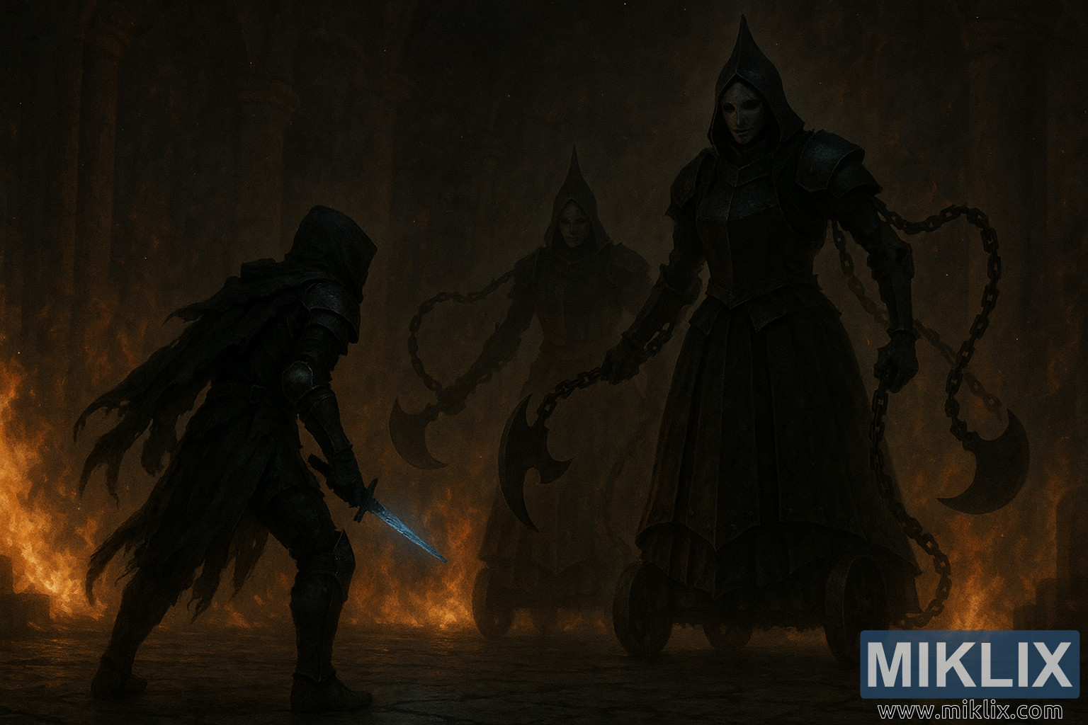ورجن کے بازو بالکل بازو نہیں ہیں بلکہ زنجیریں ہیں - موٹی، زنگ آلود تاریک کڑیاں جو جعلی لوہے سے بنے سانپوں کی طرح باہر کی طرف پھیلی ہوئی ہیں۔ ہر ایک ہلال کلہاڑی کے بلیڈ میں ختم ہوتا ہے، بھاری اور خاموش، ایک گھماؤ میں معلق جو ذخیرہ شدہ تشدد کی نشاندہی کرتا ہے، ایک تحریک تیار ہے لیکن ابھی تک جاری نہیں ہوئی ہے۔ دوسرا اغوا کرنے والا ورجن پہلے کے پیچھے ہال میں گہرائی میں کھڑا ہے — جزوی طور پر دھویں اور شعلے میں ڈوبا ہوا ہے۔ فاصلہ اس کی شکل کو ایک سلیویٹ میں نرم کرتا ہے: وہی طاعون سیاہ بکتر، وہی نقاب پوش چہرہ، وہی زنجیریں جیسے پھانسی کے وزن کی طرح لٹکی ہوئی ہیں۔ وہ ایک ساتھ مل کر ایک تہہ دار خطرہ پیدا کرتے ہیں — ایک فوری اور قریب، دوسرا آگے بڑھ رہا ہے، دیکھ رہا ہے، انتظار کر رہا ہے۔