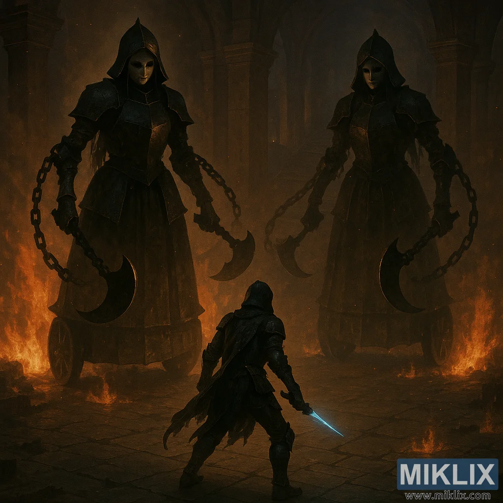 زنجیریں ان کے کندھوں سے پھیلی ہوئی ہیں، لمبی اور بھاری، سانپوں کی طرح منحنی خطوط میں لپٹی ہوئی ہیں۔ روشنی اب ہر ایک لوہے کی کڑی پر پکڑتی ہے، جس سے انہیں کل سلہیٹ کے بجائے وزن اور خطرہ ہوتا ہے۔ ان کی کلہاڑی کے بلیڈ، ہلال کے چاند کی طرح مڑے ہوئے ہیں جو قصائی کے لیے بنائے گئے ہیں، عنبر کی آگ کے مدھم عکسوں سے چمک رہے ہیں۔ وہ جھولنے کے لیے تیار اونچائی پر آرام کرتے ہیں — اور اس کھینچے جانے والے مقام سے، جس قوس پر وہ حملہ کر سکتے ہیں وہ اچانک واضح، بہت بڑا، تقریباً سنیما ہے۔ قریب کی ورجن آگے کی طرف جھکتی ہے، زنجیریں قدرے اٹھا لی جاتی ہیں، جب کہ دوسرا پیچھے رہتا ہے، پہیے بندھے ہوئے اور ساکت ہوتے ہیں، جس سے ایک کے مقابلے میں ایک مربوط دو پیش قدمی کا احساس ہوتا ہے۔