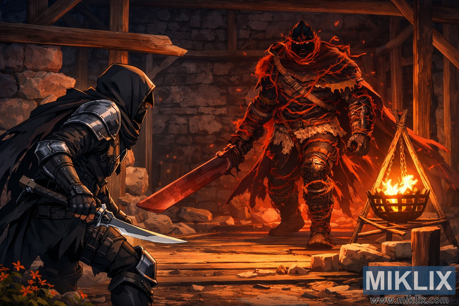 تصویر کے بائیں جانب داغدار، چیکنا سیاہ چاقو کے بکتر میں ملبوس کھڑا ہے۔ آرمر گہرا اور دھندلا ہے، جس میں پرتوں والی پلیٹیں اور باریک دھاتی جھلکیاں ہیں جو آگ کی روشنی کو پکڑتی ہیں۔ داغدار کے کندھوں پر ایک ڈھکی ہوئی چادر لپٹی ہوئی ہے، اس کی تہیں پیچھے کی طرف بہہ رہی ہیں کیونکہ کردار ایک محتاط، تیار موقف میں آگے کی طرف جھکتا ہے۔ داغدار ایک خنجر کو نیچے اور جسم کے قریب پکڑتا ہے، جو وحشی قوت کے بجائے تحمل اور درستگی کا اشارہ دیتا ہے۔ کردار کی کرنسی تناؤ اور چوکنا ہے، گھٹنے جھکے ہوئے اور وزن متوازن ہے، واضح طور پر آنے والے تصادم کا اندازہ لگا رہا ہے۔