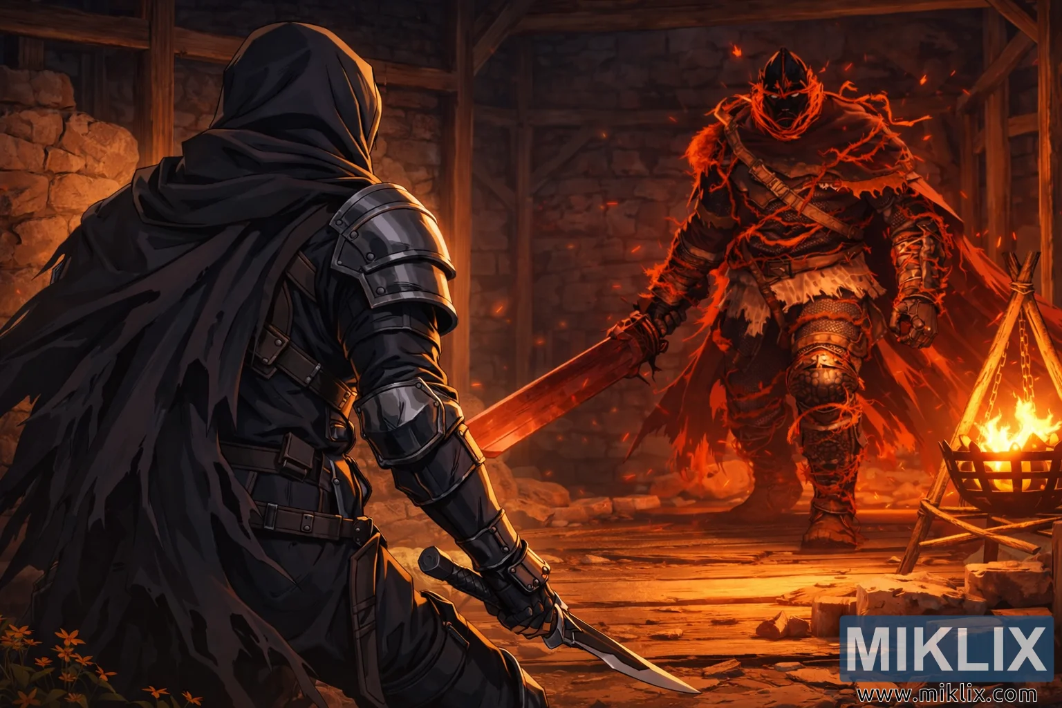 بیل بیئرنگ ہنٹر کے پاس روشن نارنجی شعلوں کے ساتھ جلتا ہوا ایک بریزیئر کھڑا ہے، جو منظر میں روشنی کے بنیادی ذریعہ کے طور پر کام کر رہا ہے۔ اس کی آگ دونوں شخصیات میں چمکتی ہوئی روشنی ڈالتی ہے، جو گرم جھلکیوں اور گہرے سائے کے درمیان مضبوط تضاد پیدا کرتی ہے۔ داغدار اور ہنٹر کے درمیان خلا اٹوٹ رہتا ہے، جس پر توقعات کا الزام لگایا جاتا ہے، لڑائی شروع ہونے سے پہلے ہی عین موقع پر قبضہ کر لیتا ہے۔ مجموعی کمپوزیشن تناؤ، پیمانے، اور ماحول پر زور دیتی ہے، جو کہ ایلڈن رنگ کی وضاحت کرتی ہے سیاہ فنتاسی جمالیاتی کے ساتھ اظہار خیال anime سے متاثر لائن ورک کو ملاتی ہے۔