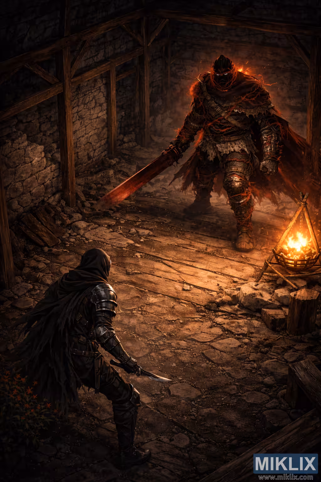 داغدار کے سامنے، منظر کے اوپری دائیں حصے پر قبضہ کرتے ہوئے، بیل بیئرنگ ہنٹر کھڑا ہے، جسے نمایاں طور پر بڑا اور زیادہ مسلط کیا گیا ہے۔ بلند زاویے سے، ہنٹر کا ماس اور موجودگی خلا پر حاوی ہے، جس سے کمرہ خود کو چھوٹا محسوس ہوتا ہے۔ بھاری آرمر پلیٹیں ہنٹر کے جسم کو گھیرے ہوئے ہیں، موٹی تہوں والی اور جوڑوں پر مضبوط ہوتی ہیں۔ پھٹا ہوا کپڑا کمر اور کندھوں سے پھٹی ہوئی، ناہموار پٹیوں میں لٹکا ہوا ہے۔ ایک گہرا سرخ نارنجی چمک ہنٹر کی شکل کے گرد مضبوطی سے کنڈلی کرتی ہے جیسے دھواں دار انگارے یا پگھلی ہوئی رگیں، پھیلتی ہوئی گرمی اور خطرہ۔ اس چمک سے چھوٹی چھوٹی چنگاریاں نکلتی ہیں اور ہوا میں تیرتی ہیں، حرکت اور بے چینی کا اضافہ کرتی ہیں۔