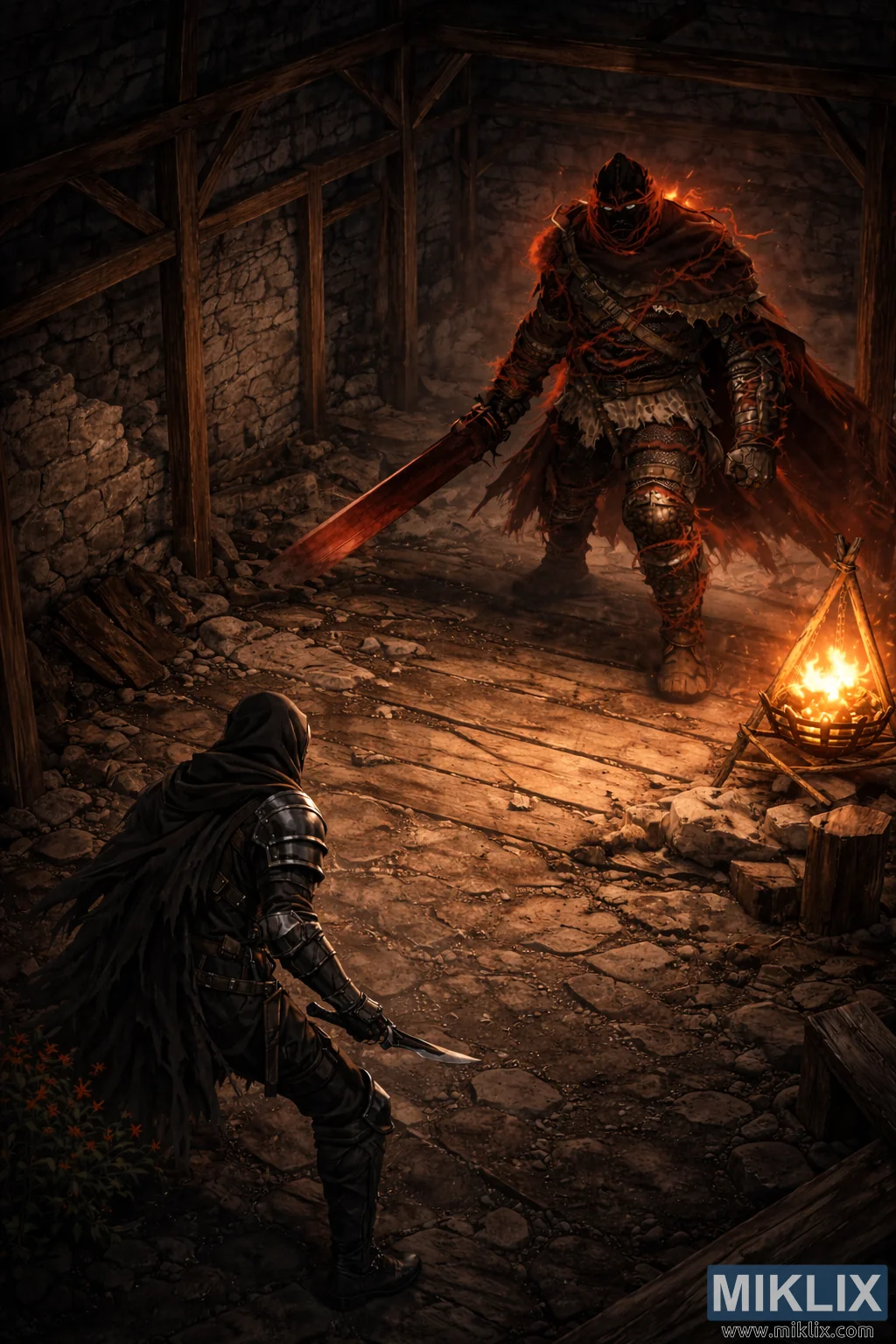 تصویر میں ایلڈن رنگ کے ایک تاریک، نیم حقیقت پسندانہ منظر کو دکھایا گیا ہے جسے ایک کھینچا ہوا، بلند آئیسومیٹرک نقطہ نظر سے دیکھا گیا ہے، جس میں وارمسٹر کی شیک کے اندر مقامی ترتیب، پیمانے اور تناؤ پر زور دیا گیا ہے۔ دونوں جنگجوؤں کو واضح طور پر فریم میں رکھتے ہوئے کیمرہ ایک زاویے سے نیچے کی طرف دیکھتا ہے، جس سے جھونپڑی کے اندرونی حصے کا مزید انکشاف ہوتا ہے۔ موٹی لکڑی کے شہتیر دیواروں اور چھت کے ساتھ ایک کنکال کا ڈھانچہ بناتے ہیں، ان کی سطحیں کھردری، کٹی ہوئی اور بوڑھی ہوتی ہیں۔ پتھر کی دیواریں ناہموار اور پھٹے ہوئے ہیں، ڈھیلے ملبے اور گرے ہوئے پتھر کمرے کے کناروں کے ساتھ جمع ہو رہے ہیں۔ لکڑی کے فرش کے تختے خراب اور پہنے ہوئے ہیں، گندگی کے ٹکڑوں، ٹوٹے ہوئے تختوں، اور بکھرے ہوئے ملبے کی وجہ سے رکاوٹ بنتے ہیں، جو طویل عرصے تک ترک کرنے اور بار بار تشدد کا اظہار کرتے ہیں۔