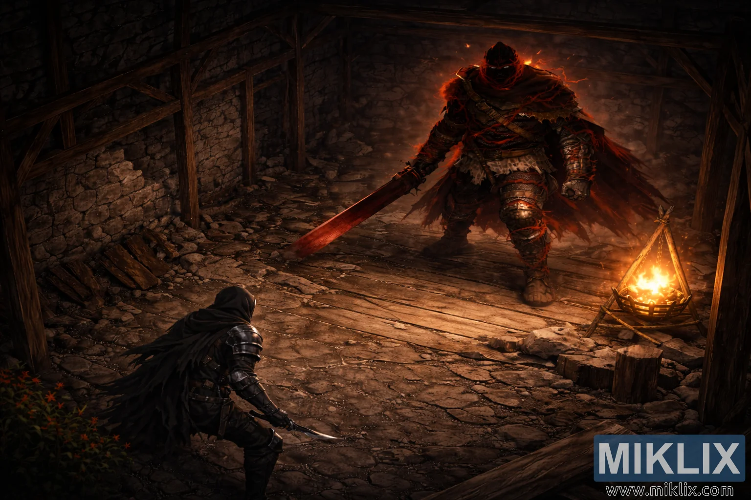 زمین کی تزئین کا، آئیسومیٹرک ایلڈن رنگ کا منظر جس میں وارماسٹر کی جھونپڑی کے اندر داغدار اور بیل بیئرنگ ہنٹر کے درمیان لڑائی سے پہلے کے کشیدہ تصادم کو دکھایا گیا ہے۔