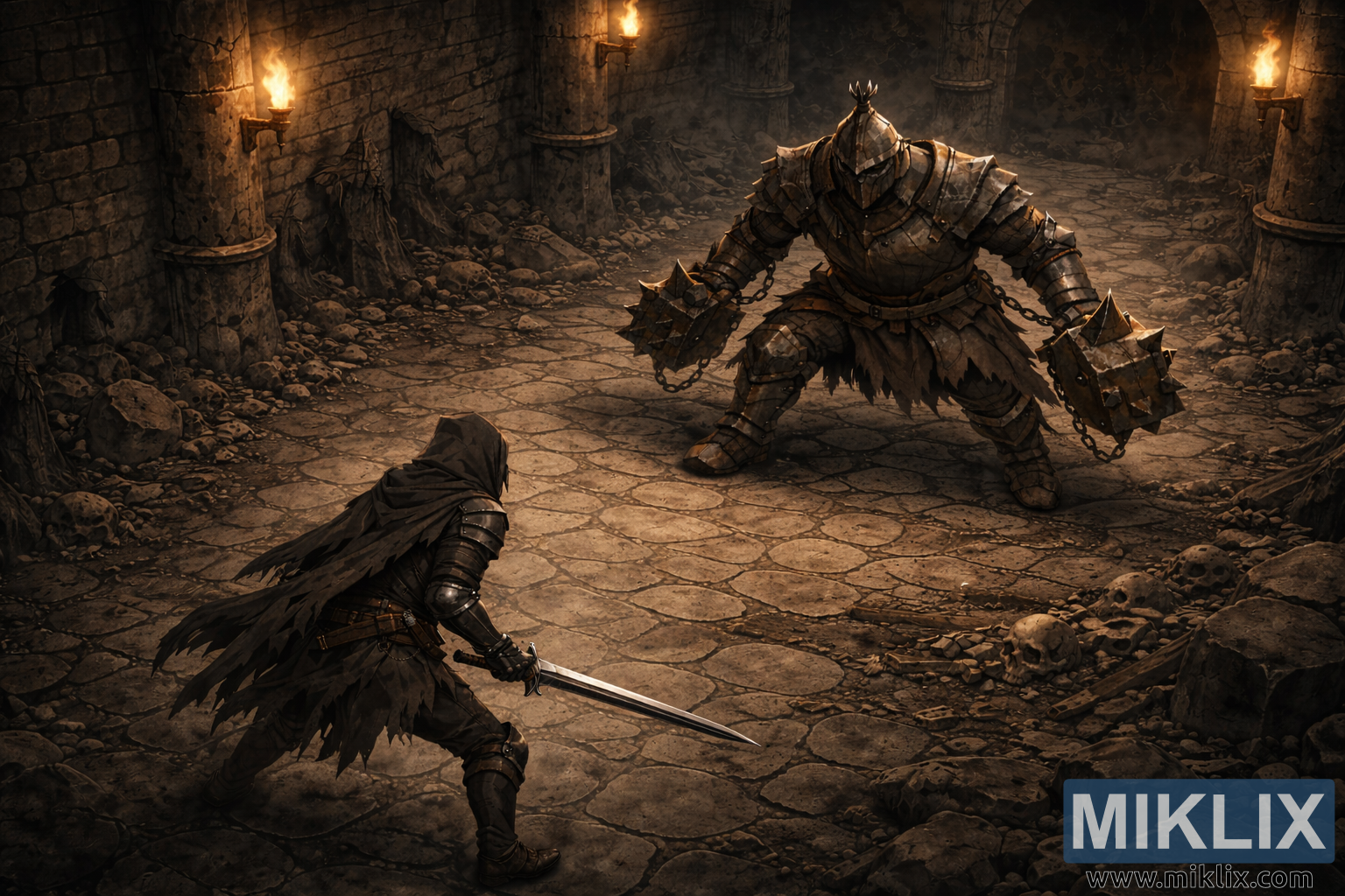 چیمبر کے اس پار، فریم میں اونچے مقام پر اور قدرے دائیں طرف، گریو وارڈن ڈیوئلسٹ کو دیکھتا ہے۔ اس بلند نقطہ نظر سے، ڈوئلسٹ کے سائز اور بڑے پیمانے پر پیمانے اور پوزیشننگ کے ذریعے زور دیا جاتا ہے۔ ڈوئلسٹ موٹی، تہوں والی بکتر میں ملبوس ہے جو بھاری اور محدود دکھائی دیتا ہے، جس میں زنگ آلود سطحیں، کٹے ہوئے کناروں، اور گہری خروںچیں ہیں جو بار بار، وحشیانہ لڑائی کے بارے میں بتاتی ہیں۔ دونوں بازوؤں کے گرد بھاری زنجیریں لپیٹ دی جاتی ہیں، ہر ایک بہت بڑے ہتھوڑے سے منسلک ہوتا ہے جو نظر آنے والے وزن کے ساتھ لٹکتے ہیں۔ ہتھوڑے زمین کے قریب آرام کرتے ہیں، اپنے کچلنے والے ماس کو تقویت دیتے ہیں۔ ڈوئلسٹ کا ہیلمٹ ان کے چہرے کو مکمل طور پر دھندلا دیتا ہے، انفرادیت کے کسی بھی نشان کو ہٹاتا ہے اور انہیں ایک غیر شخصی، جلاد جیسی موجودگی فراہم کرتا ہے۔ ان کا موقف وسیع اور زمینی ہے، پاؤں مضبوطی سے الگ لگائے گئے ہیں، گویا زبردست طاقت کو اتارنے کے لیے تیار کیے گئے ہیں۔