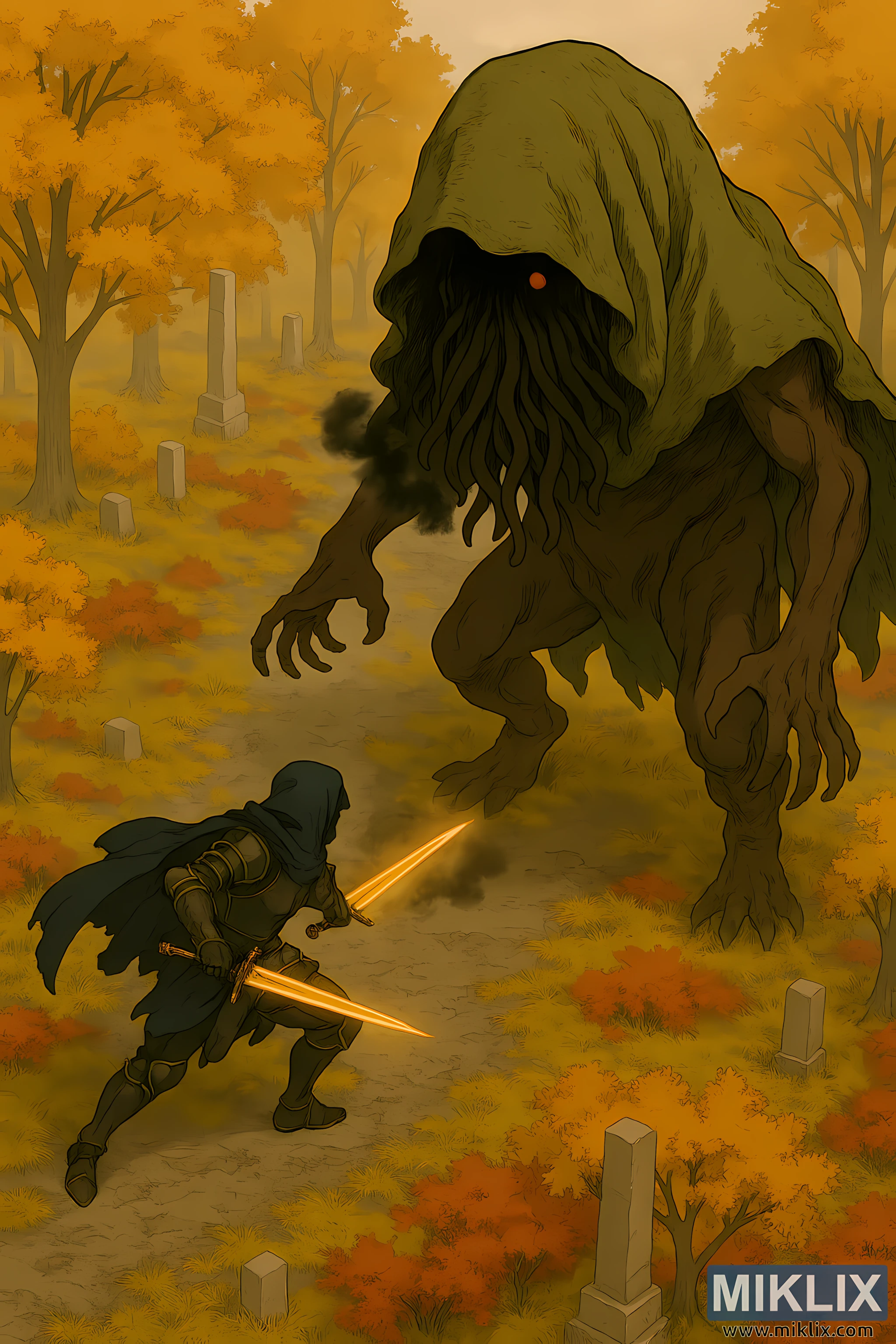 ایلڈن رنگ سے متاثر اس بھرپور تفصیلی پرستار آرٹ میں، الٹس پلیٹاؤ کے پرسکون، اداس پھیلاؤ میں ایک ڈرامائی تصادم سامنے آتا ہے۔ یہ ترتیب خزاں کا قبرستان ہے، جہاں سونے، نارنجی، اور زنگ آلود پودوں کے متحرک دھلوں کے درمیان زمین سے پتھروں کے نشانات کی قطاریں اٹھتی ہیں۔ لمبے لمبے درخت، ان کے پتے عنبر کی گرم چھاؤں میں تبدیل ہوتے ہیں، اوپر کی طرف پھیلتے ہیں اور دھندلے پس منظر کو فریم کرتے ہیں، ان کے تنے نرم کہرے میں گھل جاتے ہیں جو دور جنگل کو کمبل بنا دیتا ہے۔ ہوا ساکن محسوس ہوتی ہے، پھر بھی قدیم خوف کے احساس سے بھری ہوئی ہے۔