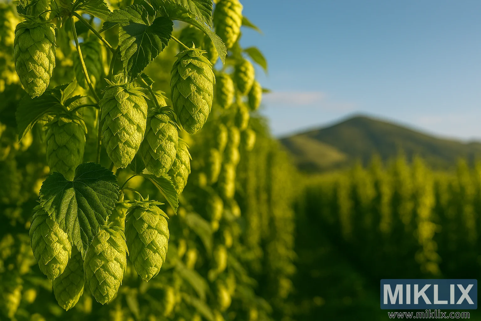 سنہری روشنی میں نہا ہوا ایک پُرسکون ہاپ کا میدان صاف نیلے آسمان کے نیچے خوشبودار شنک اور گھومتی ہوئی پہاڑیوں کی نمائش کرتا ہے جو کہ فطرت اور پکنے کی روایت ہے۔